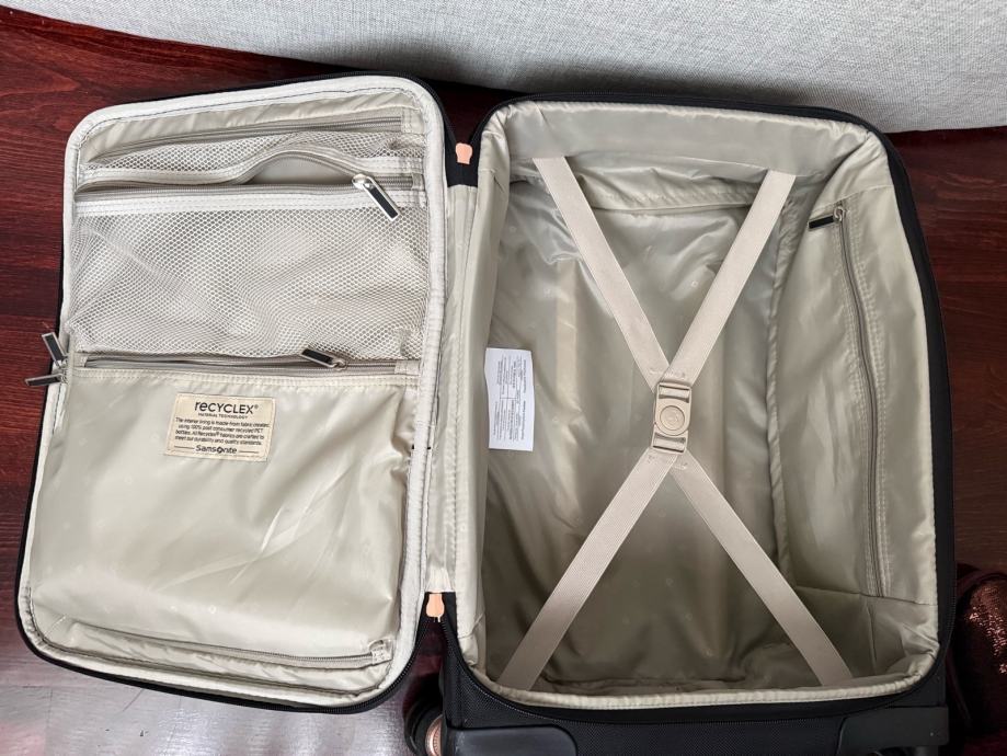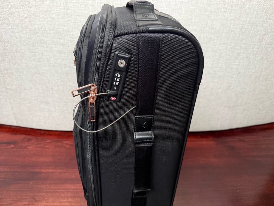 Ima četiri pretinca s patentnim zatvaračima na prednjoj strani, što omogućuje praktičan pristup stvarima bez otvaranja glavnog odjeljka. Ručka za vuču je teleskopska s metalnim šinama u tonu ružičastog zlata, a na bočnoj strani nalazi se TSA kombinacijska brava za dodatnu sigurnost pa ne trebate nositi ključeve.