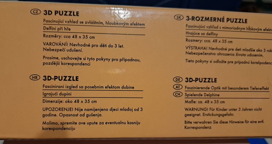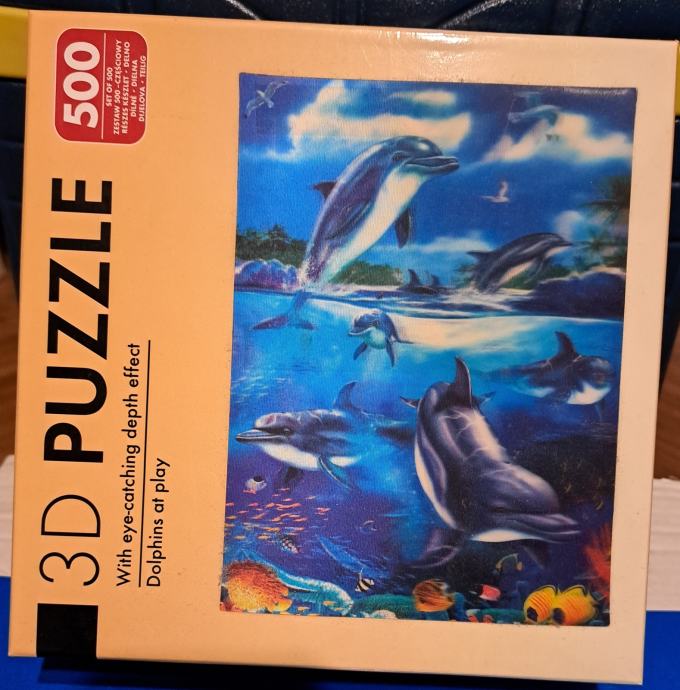 Prodajem 3D PUZZLE, DELFINI U IGRI. Sa posebnim efektom dubine. Nije namijenjeno djeci mlađoj od 3 godine. (Opasnost od gušenja.)