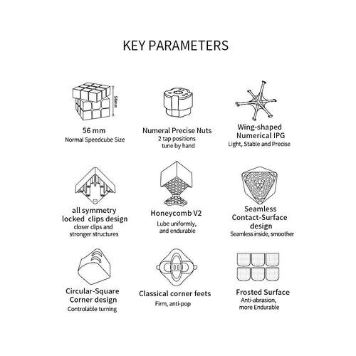 Jednoj od najkvalitetnijih kocaka na tržištu. Vrhunski odrađen "corner cutting" od 55°, te 30° unatrag. Honeycomb izrada unutrašnjosti kocke u stilu pčelinjih saća, koje ravnomjerno rasprostranjuju podmazivanje kocke i čine ju dugotrajnijom. Specijalna GTN jezgra sa čvrstom oprugom i 2 prilagodljiva nivoa čvrstoće pri okretanju. Pogledajte i video opis kocke.