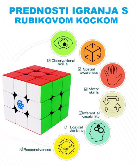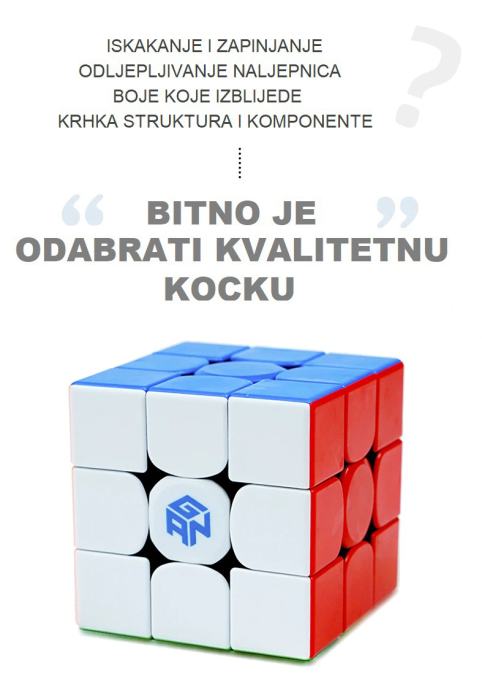 Premium kvalitete, nema zapinjanja i štopanja. Jako brzo i jednostavno se okreće. Pločice nemaju naljepnice i nije moguće varati. U paketu dođu i mini upute kako složiti kocku.