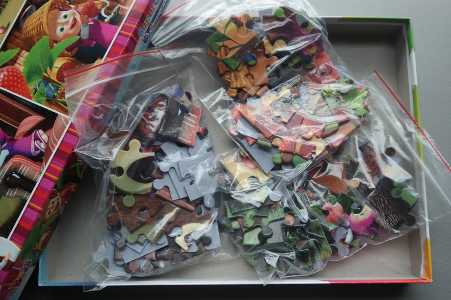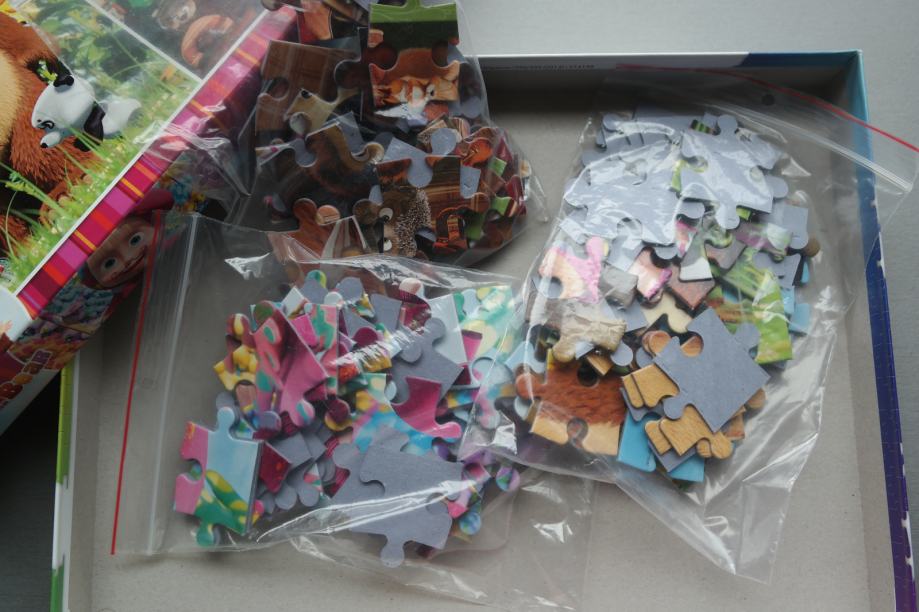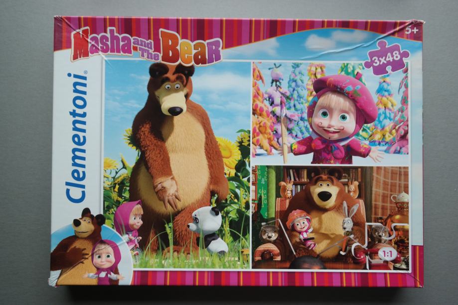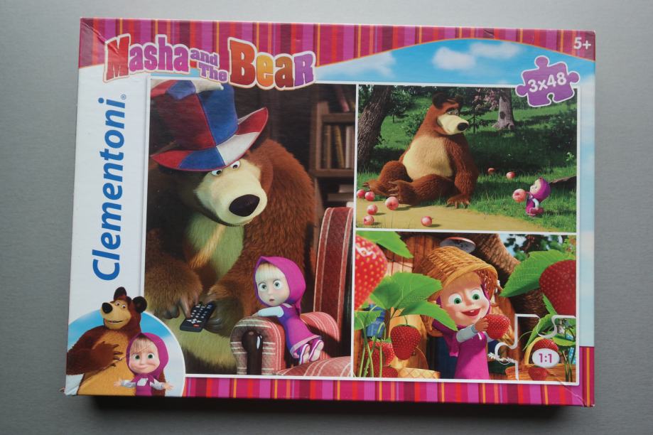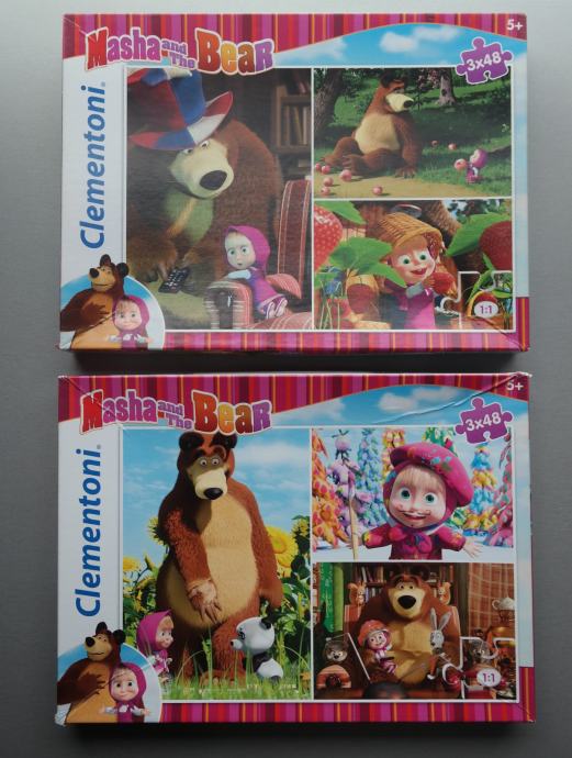 Lot 2 puzzle, Maša i Medo, oboje 3 u 1 tj. s po tri slike za slaganje, Clementoni, za dob 5+, malo korištene, tragovi korištenja samo na kutiji