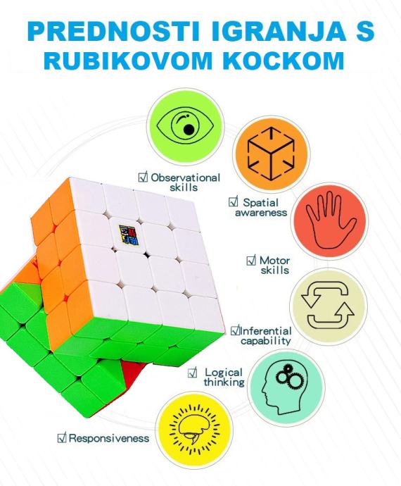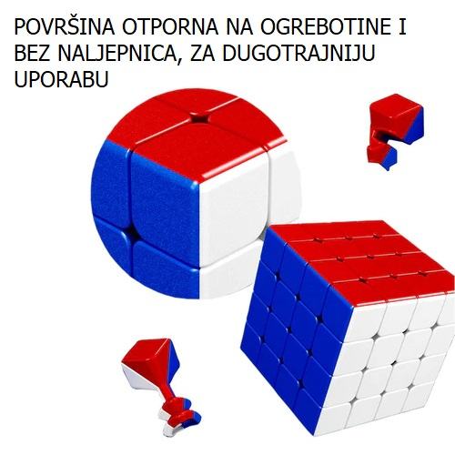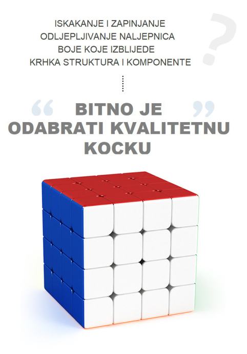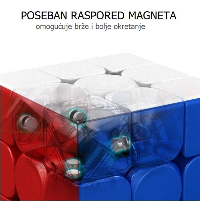 Premium kvalitete, sa posebno dizajniranim ćelijama koje spriječavaju zapinjanje i štopanje. Jako brzo i jednostavno se okreće zahvaljujući magnetima poredanim između stjenki rubova. Pločice nemaju naljepnice i nije moguće varati. U paketu dođu i mini upute kako složiti kocku.