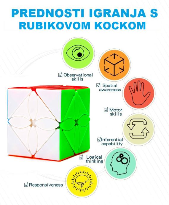 Opremljena je novim mehanizmom koji se brže i lakše okreće. Premium kvalitete, nema zapinjanja i štopanja. Jako brzo i jednostavno se okreće. Specijalne površine za bolju kontrolu i prihvat, vrlo kvalitetna i okretljiva. Pločice nemaju naljepnice i nije moguće varati. U paketu dođu i mini upute kako složiti kocku.