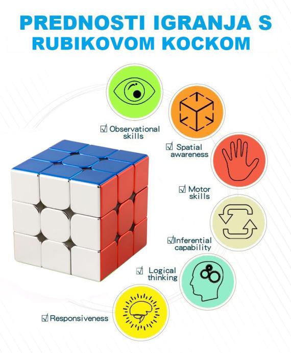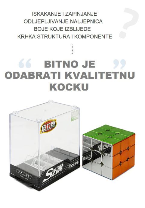 Premium kvalitete, nema zapinjanja i štopanja. Jako brzo i jednostavno se okreće. Pločice nemaju naljepnice i nije moguće varati. U paketu dođu i mini upute kako složiti kocku.
