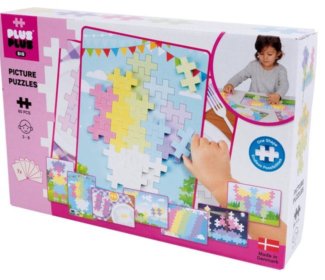 Plus-Plus Big is perfect for smaller hands or bigger ideas. This picture puzzle includes 60 pastel color big pieces and 7 puzzle flash cards. Every puzzle has two sides - a challenge and a solution.Designed and made in DenmarkBPA-free and phthalate-freeBIG is safe from 0+ yearsEach BIG piece measures 50mm x 30mmSimplistic shape. Endless possibility! The only tools required are the children's imagination. Plus Plus is a fun, interactive building system where a child can be creative and strengthen motor skills with shape, colour and form.Plus-Plus develops the imagination and creativity of children and appeals evenly to boys and girls predominantly within the ages 3 to 12 years. Once Plus-Plus has been tried out it becomes a kid's favourite. Many hours of intensive play.Plus Plus bricks is made in Denmark of PE (polyethylene) and has successfully passed the normal tests and standards for toys: EN 71-1, 71-2, 71-3. Free of phthalates and PVC.Every single piece of Plus-Plus is produced at our own factory in Holbæk, Denmark. We are very concerned that our product do not contain materials that could harm any child. We ensure this by:Plus-Plus® is constantly being tested and is approved according to EU toy standards: EN 71-1, 71-2, 71-3. These tests are performed by external and independent laboratories.Plus-Plus® is approved for food & beverage (just like bottles for water), so it will not harm a child who would put it in the mouth.Plus-Plus® has clear approval of phthalates, which document that Plus-Plus® is free from phthalates.Plus-Plus® incl. our packaging is free from PVC.Even though we carefully select and trust our vendors who deliver goods to our production, we choose to perform extra controls by facilitating tests of all goods (minimum once yearly), to make sure they meet our criteria to the goods we use for Plus-Plus® production. In these tests all goods are subject to immigration tests to ensure that nothing immigrates to a human who is in contact with our product.