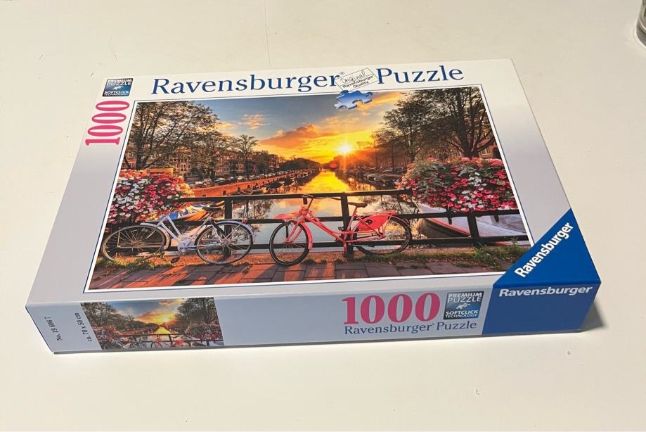 Prodajem Ravensburger puzzle s 1000 dijelova. Motiv prikazuje romantičnu scenu s biciklima na mostu uz kanal u zalasku sunca. Puzzle su jrabljene. Vel 70x50 cm.