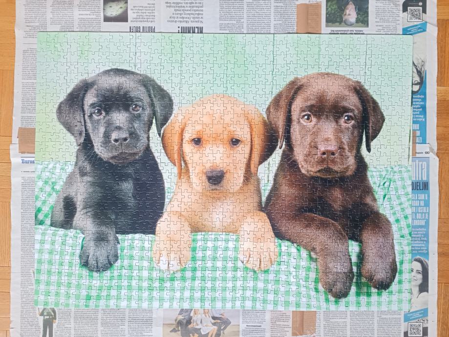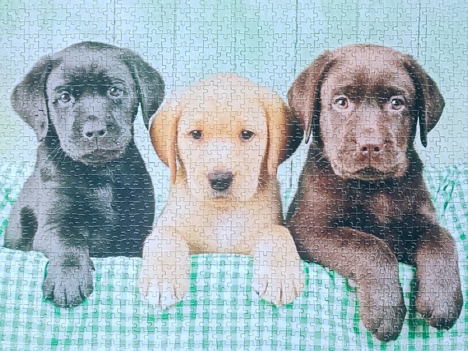 Puzzle proizvođača Clementoni "Three Labs" prikazuju tri štenca pasmine Labrador retriver.