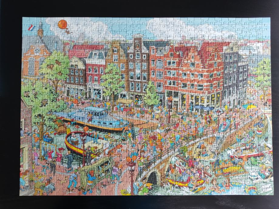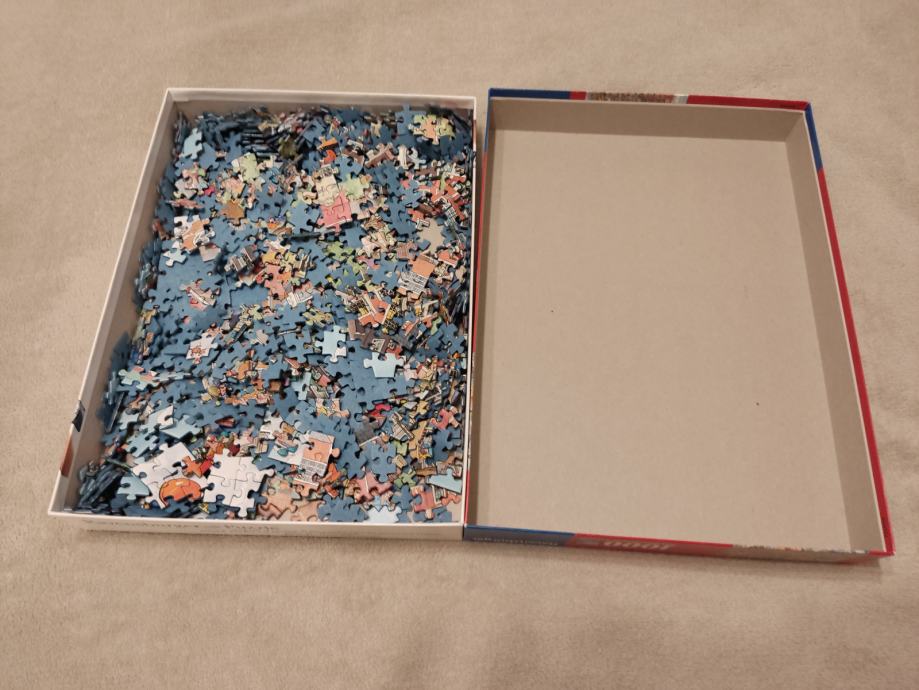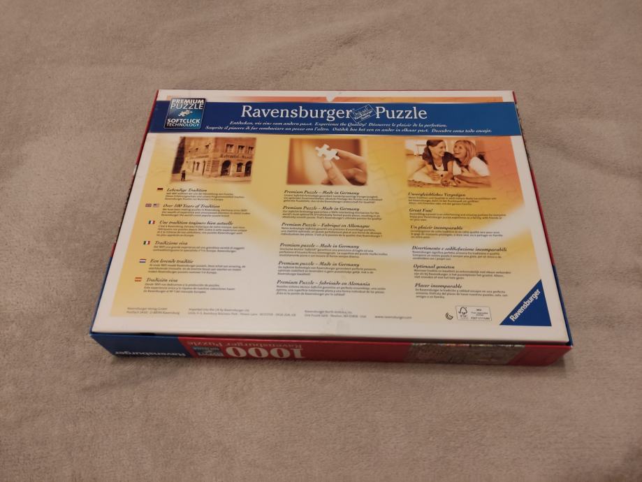 Ravensburger puzzle od 1000 komada. Cities of the world - Amsterdam. Specifičnost te kolekcije je što se pojavljuju dva lika koja nisu u istoj pozi na kutiji i na složenim puzzlama. Jednom složene i vraćene u kutiju. Nijedna ne fali, vidi se na slici gdje su složene. Pogledajte i ostale moje oglase, na više kupljenih stvari popust.