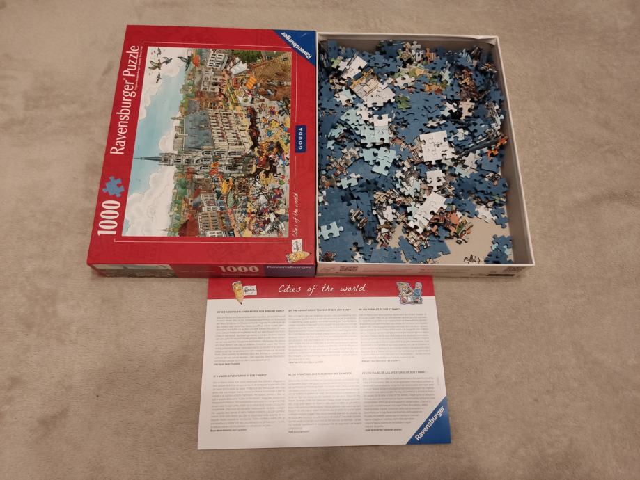 Ravensburger puzzle 1000 komada. Cities of the world - Gouda. Jednom složene i vraćene u kutiju. Nijedna ne fali, vidi se na slici gdje su složene. Pogledajte i ostale moje oglase, na više kupljenih stvari popust. U Zagrebu i Karlovcu je moguća primopredaja.