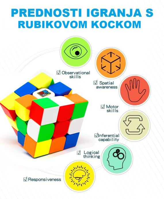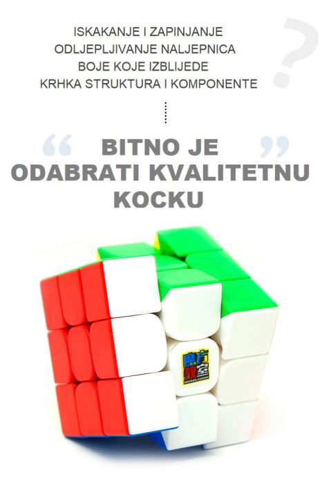 Premium kvalitete, nema zapinjanja i štopanja. Jako brzo i jednostavno se okreće. Pločice nemaju naljepnice i nije moguće varati. U paketu dođu i mini upute kako složiti kocku.