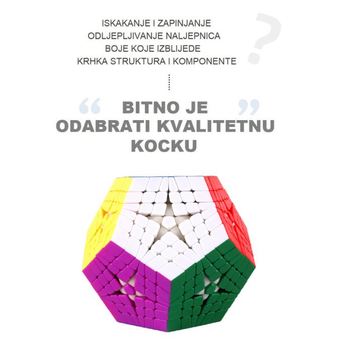 Premium kvalitete, nema zapinjanja i štopanja, brzo i jednostavno se okreće. Prilagođene površine, s udubinama, za bolju kontrolu i prihvat, vrlo kvalitetna i okretljiva. Pločice nemaju naljepnice i nije moguće varati. U paketu dođu i mini upute kako složiti kocku.