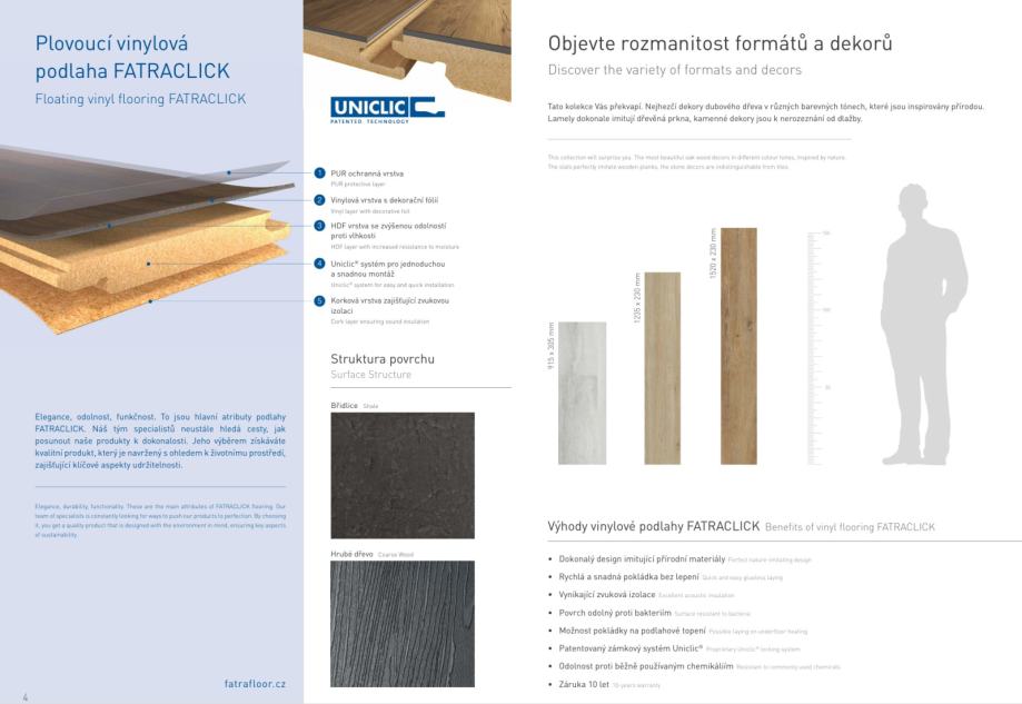 Struktura vinilnih podova svrstava se među najkvalitetnije podne obloge na svijetu, uglavnom zahvaljujući svojim izvrsnim svojstvima. Ovi plutajući podovi imaju antibakterijsku završnu obradu, izvanrednu zvučnu izolaciju, brzu i jednostavnu ugradnju čak i na sustave podnog grijanja.