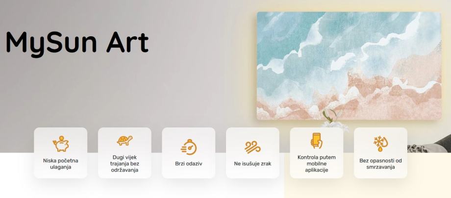 IC paneli MySun Art istovremeno su panel i slika koja će vaš dom krasiti tijekom cijele godine. Bilo da se radi o bajkovitim motivima u dječjoj sobi ili lijepim morskim motivima u kupaonici, vaše će jutarnje rutine uvijek biti ugodne i udobne, bez obzira na mjesec u godini. IC paneli MySun Art funkcionalni su tijekom cijele godine.