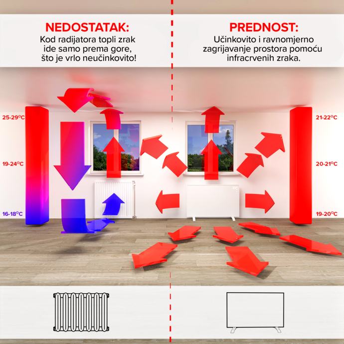 Tehnologija infracrvenih valova u grijačima osigurava visoku stopu pretvorbe električne energije, do 98%