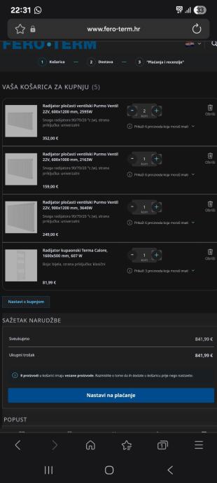 Prodajem nove radijatore, nikad otvoreni(zapakirani). Nažalost racun nemam ali na slici se vide cijene u Ferotermu, ukupna cijena je 840e.