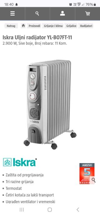 Uljni radijator Iskra YL-B07FT-11 je moderan električni radijator koji zahtijeva 2500 W snage za rad i nudi 3 razine: 800W/1200W/2500W + ventilator 400W. Karakterizira ga tihi rad i visoka akumulacija topline, što znači da radijator dugo emitira toplinu nakon isključivanja.