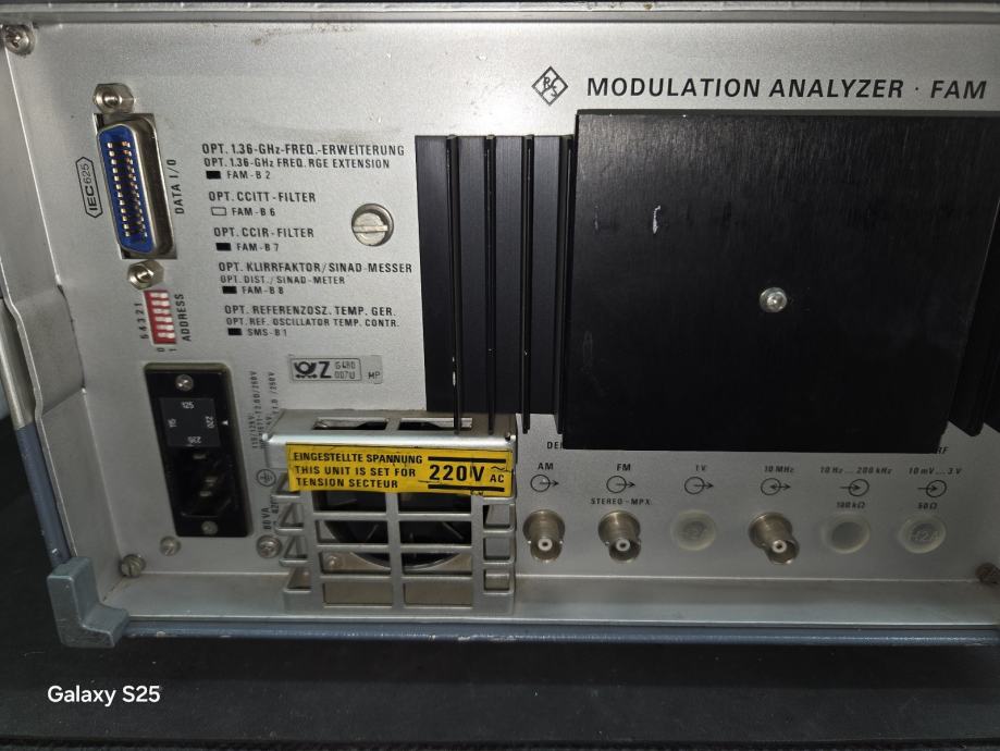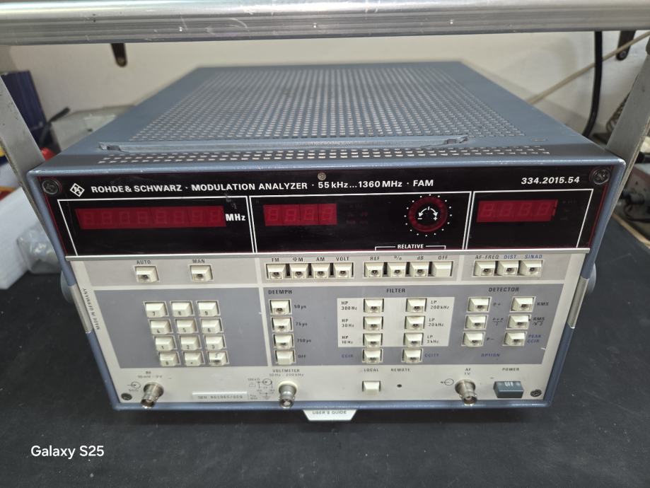 Analizator modulacije FAM R&S 1360MHz, sa ugrađenim opcijama B2,B7,B8,B1 (Frekventno područje do 1.36GHz, CCIR filter, Voltmetar 10 Hz - 200 KHz, automacki distorziometar, temperaturno kontrolirani referentni oscilator). Kontrolni AF izlaz/1V, prikaz AF frekvencije.