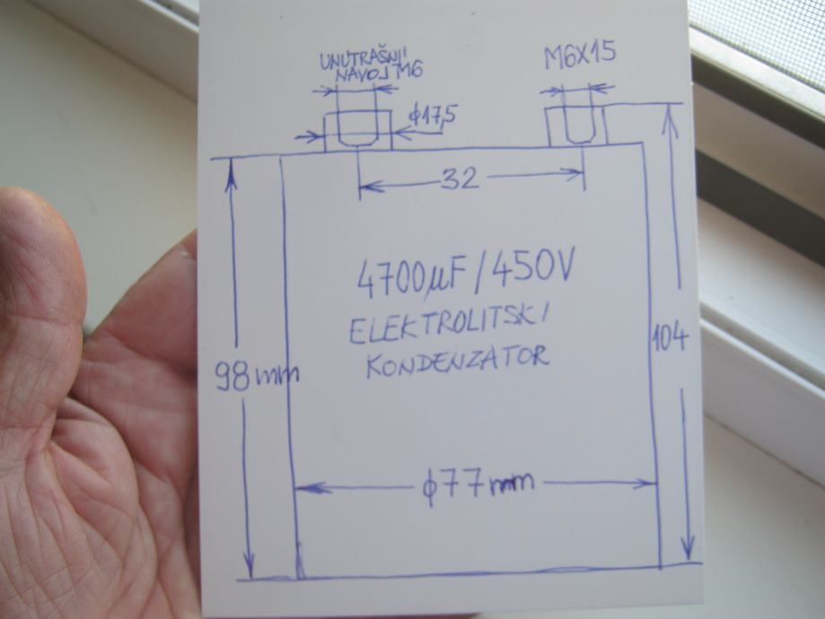 IZVODI KONDENZATORA SPAJAJU SE VIJKOM, U PRODAJI 3 KOMADA, (KOMAD 20 EURA). ALUMINUM ELECTROLYTIC CAPACITATORS, INVERTER CAPACITOR/SCREW TERMINAL. SLIKE 10 - 15. DIMENZIJE Fi 77mm x 98/104 mm.