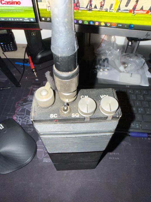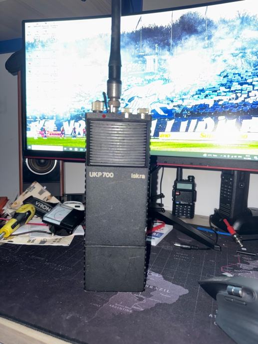 Prodajem rabljenu prijenosnu radio stanicu Iskra UKP 700. Radi se o kompaktnom ručnom uređaju crne boje s antenom, koji ima kontrole za odabir kanala (CH), glasnoću (VOL), squelch (SQ) i SC prekidač na gornjem dijelu kućišta. Na uređaju se nalazi naljepnica s frekvencijama 457.000 i 457.350. Uz nju ide originalni punjac. Radio stanica radi!
