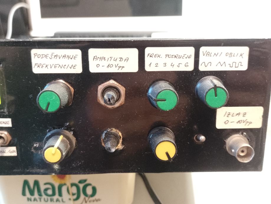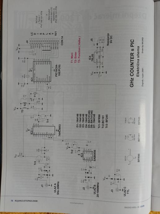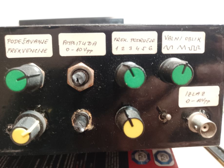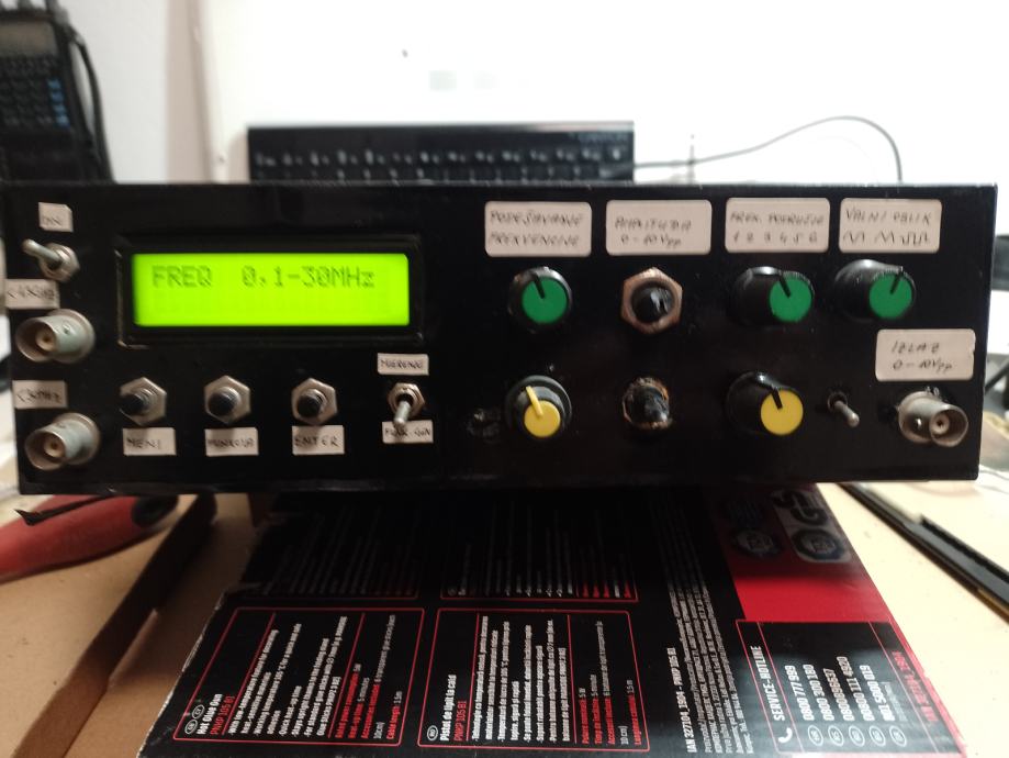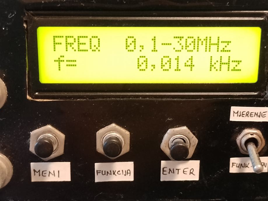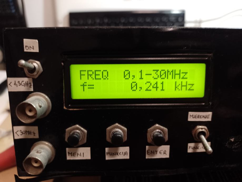 Mjerač frekvencije do 1,3 GHZz i ton generator do 3,5 MHz , signala svih oblika . Mjerač je rađen sa IC PIC 16F84, šema je iz časopisa HRSa br. 5 iz 2008 g, autora Vlade Novaka 9A2NV,a mjerenja je vršio Zlatko Kovačević ,9A3AQ.Mjerač ima 2 ulaza , prvi od 5 do 30 MHZ i drugi je do 1,3 GHz . U istoj kutiji je ugrađen i ton generator sa IC MAX 038CPP, svaki uređaj se uključuje posebno , tako da frekvenc metar ujedno služi za očitanje i kontrolu frekvencije za ton generator .SvaKi sklop ima svoje posebno napajanje .Imam kpt šemu za frekvenc metar i ton generator.U ispravljaču generatora ugrađena stabilizacija napona napajanja.Displej za očitanje je original tvornički sklop GDM1602E.Uređaj je ubačen u kutiju ali nija rađena prednja ploča , izvedena je kao improvizacija za vrijeme ispitivanja i podešavanja , što je i vidljivo na fotografijama. . Za detaljnije informacije javite se .