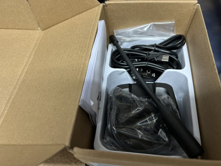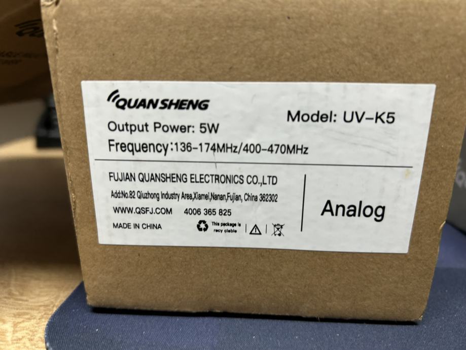 U kompletu: stanica, punjač na stalak (UV-K5), male slušalice i mikrofon (zajedno), antena, baterija, USB-C kabel, kopča za remen.
