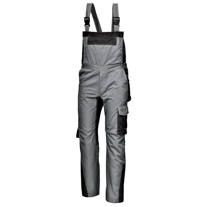 Polukombinezon od 100% pamuka Massaua, težina 280 g/m². Podesive naramenice s brzim kopčama, džep na prsima s poklopcem i čičkom, bočni džepovi, trodimenzionalni stražnji džepovi s poklopcem i čičkom, višenamjenski džep za alat s poklopcem i čičkom, s držačem za olovke i džepom za telefon, džep za mjerač s držačem za alat s desne strane, bočni otvori s dva gumba, elastična stražnja traka u struku, dvostruko šivani šavovi. Pojačanja od kontrastne boje.