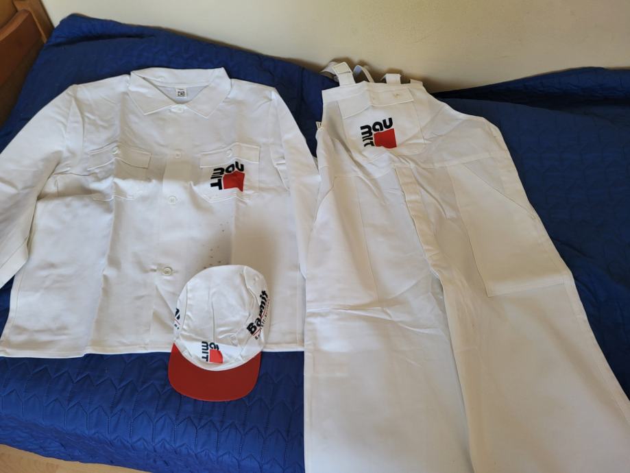 Muški kombinezon na tregere, pripadajuća košulja s dugim rukavima i kapa šilterica.
