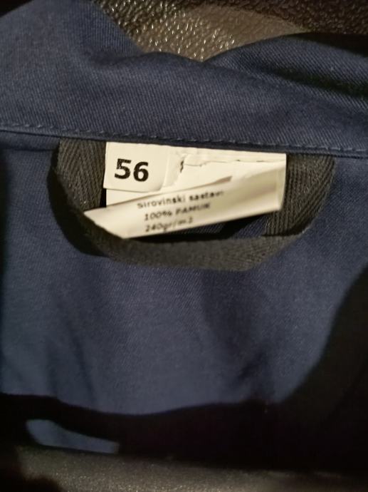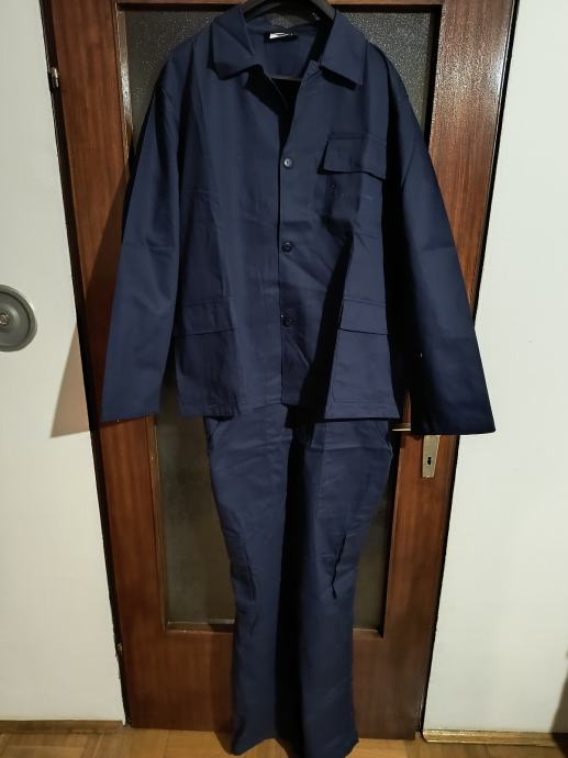 Prodajem novo radno odijelo u tamnoplavoj boji, veličina 56, s etiketom. Komplet se sastoji od jakne s kopčanjem na gumbe i džepovima te tregerica s podesivim naramenicama. Materijal je 100% pamuk, 240 g/m², što osigurava ugodnost i izdržljivost pri svakodnevnom korištenju.