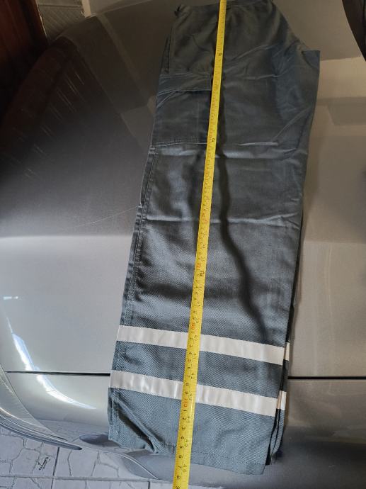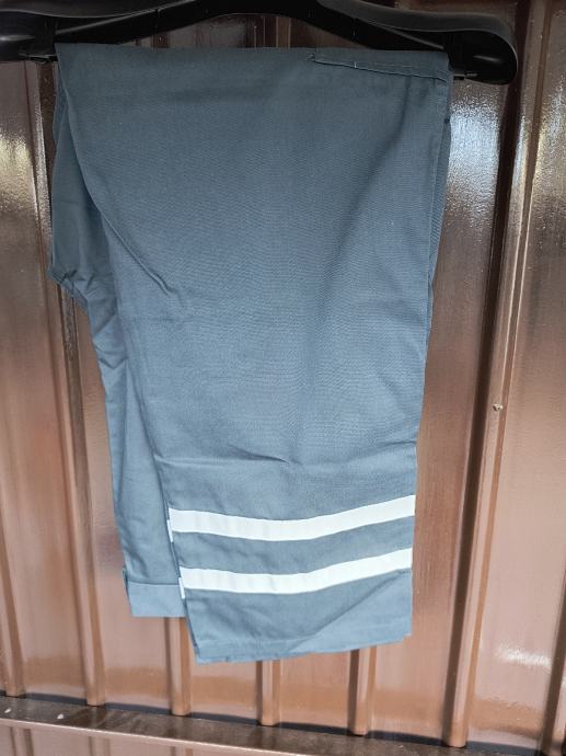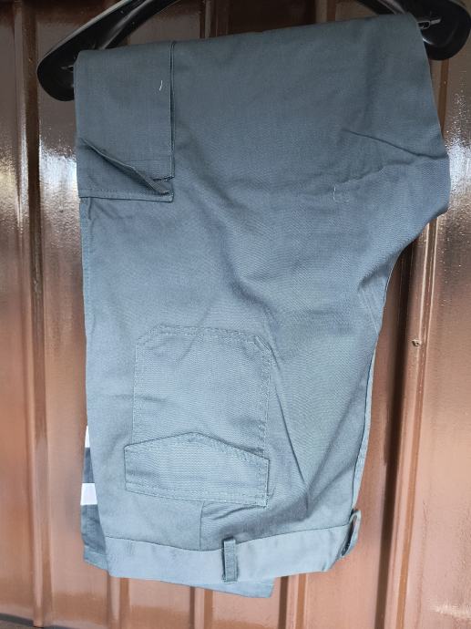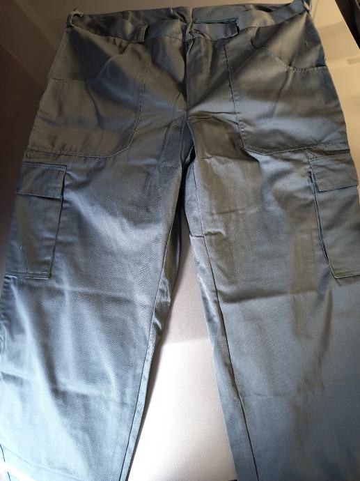 Muške radne hlače na remen, maslinasto zelene boje, veličina br. 60, širina struka 55 cm (opseg struka 110 cm), materijal: pamuk 50 % / poliester 50%, novo.