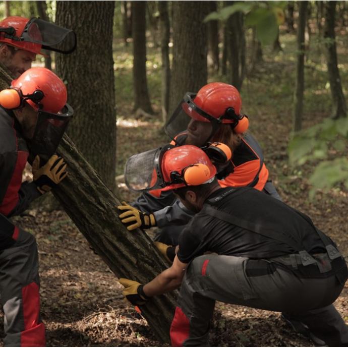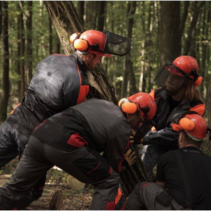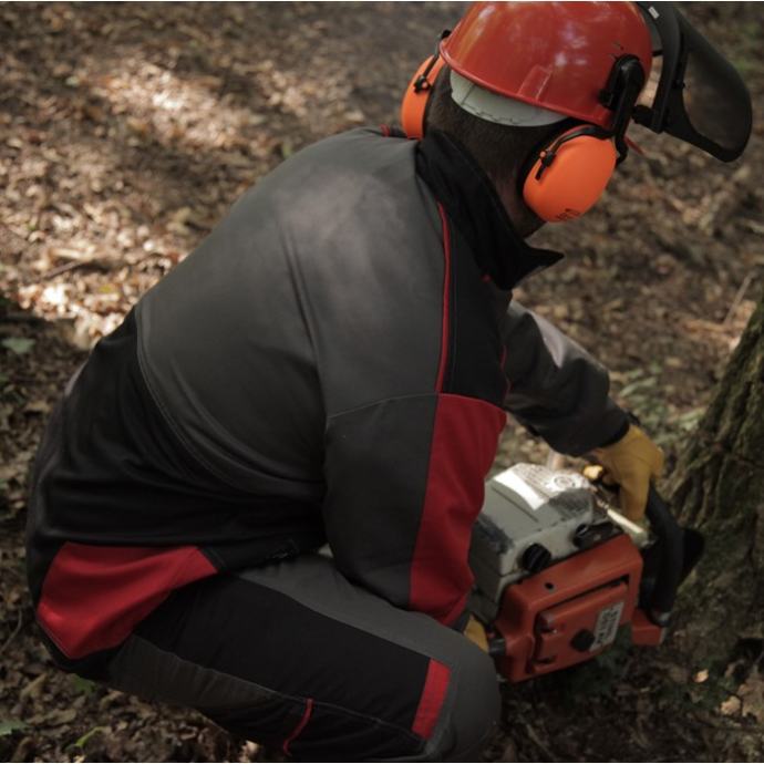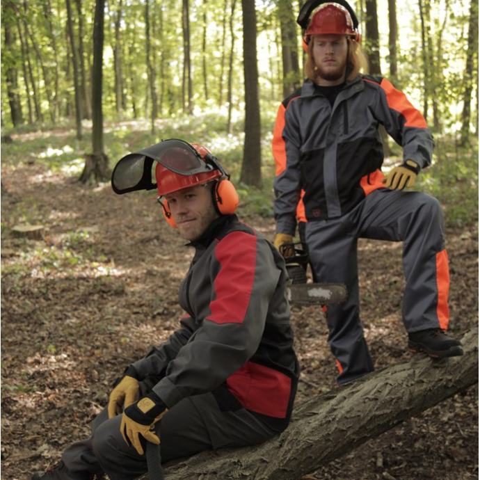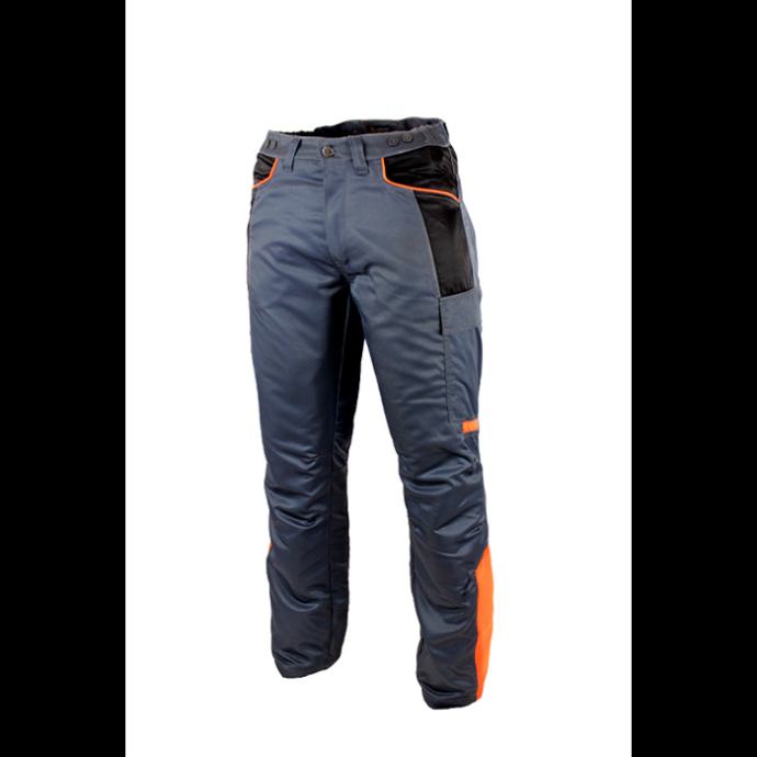 Proturezne zaštitne hlače sa jednostranim skrivenim patent zatvaračem te gumbom u struku. Ušiven džep straga džep s preklopom, našiven bočni džep sa preklopom i alat džep. Uz hlače dolaze odvojivi tregeri.
