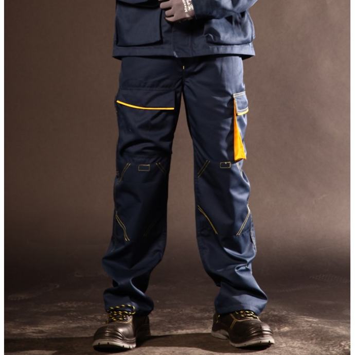 Radne farmer hlače izrađene su od izdržljive tkanine u mješavini poliestera i pamuka. Kopča se skrivenim patent zatvaračem, a tregeri su podesivi. Ima 8 funkcionalnih džepova i dodatno pojačanje na koljenima s džepom za štitinke za koljena. Kroj je klasičan i dobro pristaje svima.