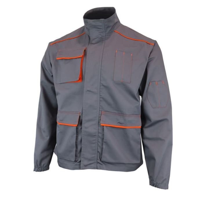 Radna jakna izrađena je od izdržljive tkanine u mješavini poliestera i pamuka. Kopča se skrivenim patent zatvaračem i drukerima, ima klasični ovratnik, 5 funkcionalnih džepova i elastičnu traku na rukavu. Kroj je klasičan i dobro pristaje svima.