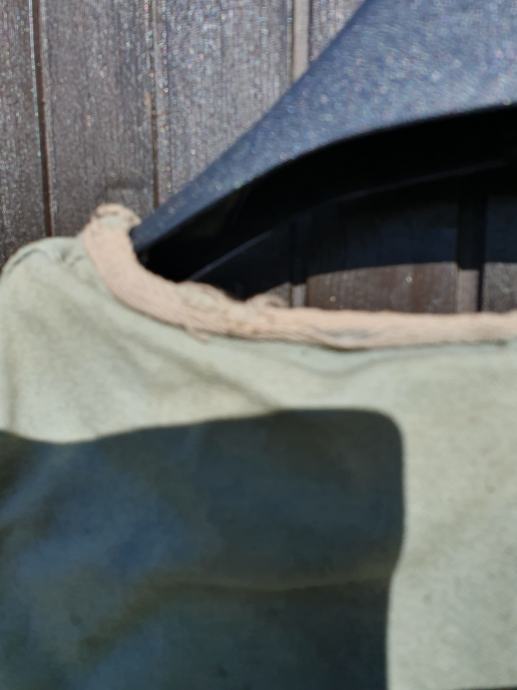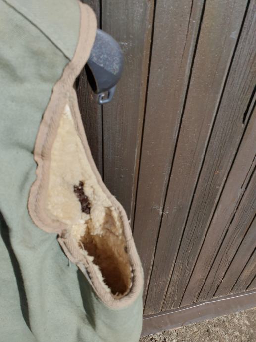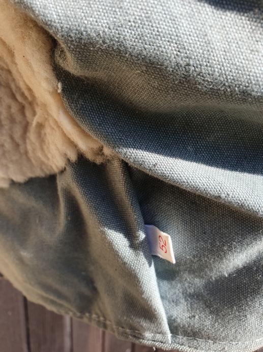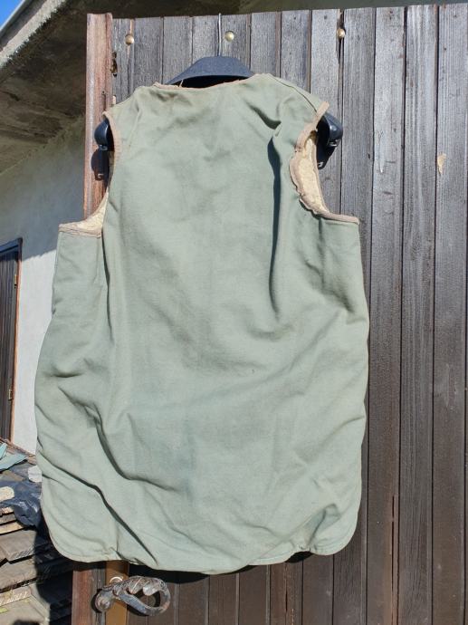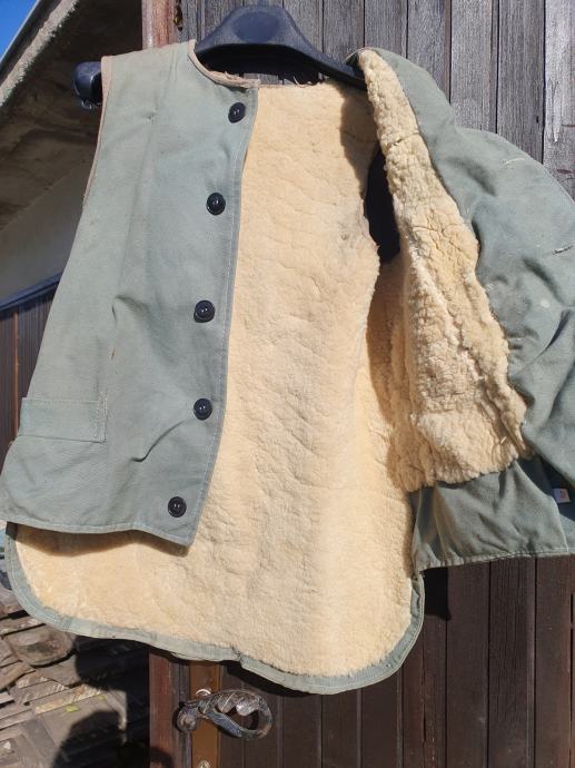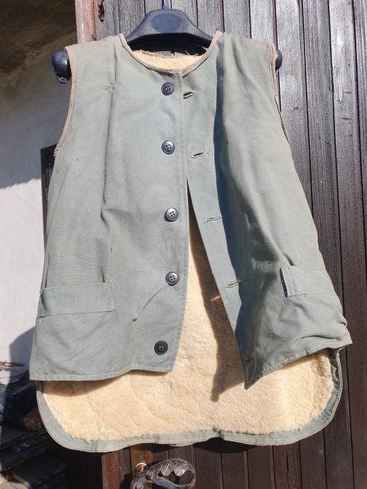 Prsluk bez rukava. Iz devedesetih. Vojni, broj 52 ( L ). Izvana sivo-zeleno ( SMB ) jako šatorsko platno. Iznutra pravo krzno. Kopčanje gumbima. Nepromočiv. Topao.