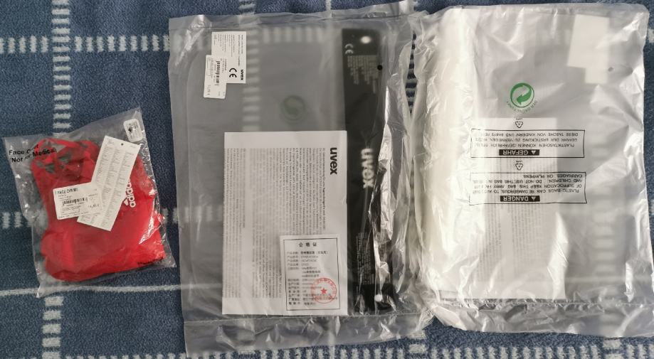 Prodajem u kompletu potpuno novo i zapakirano: dva Uvex vizira sa spužvom i elastičnom trakom koja se stavi oko glave, tri Adidas maske.