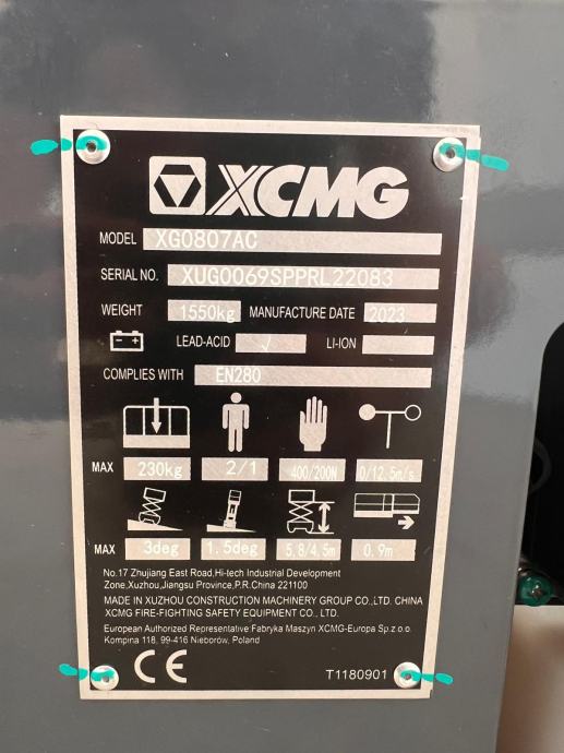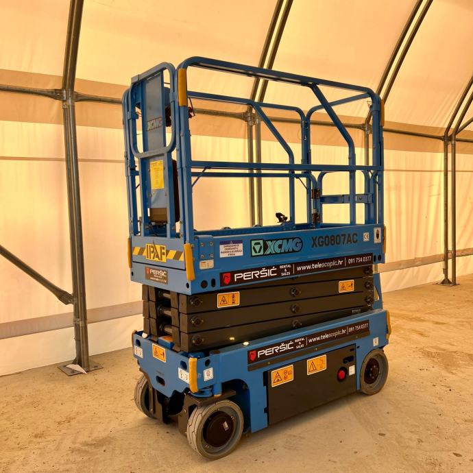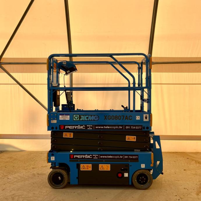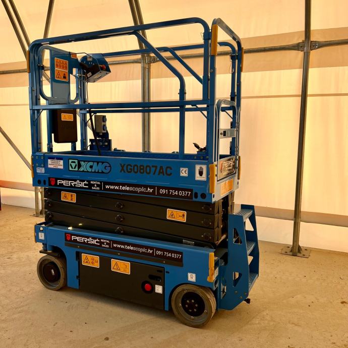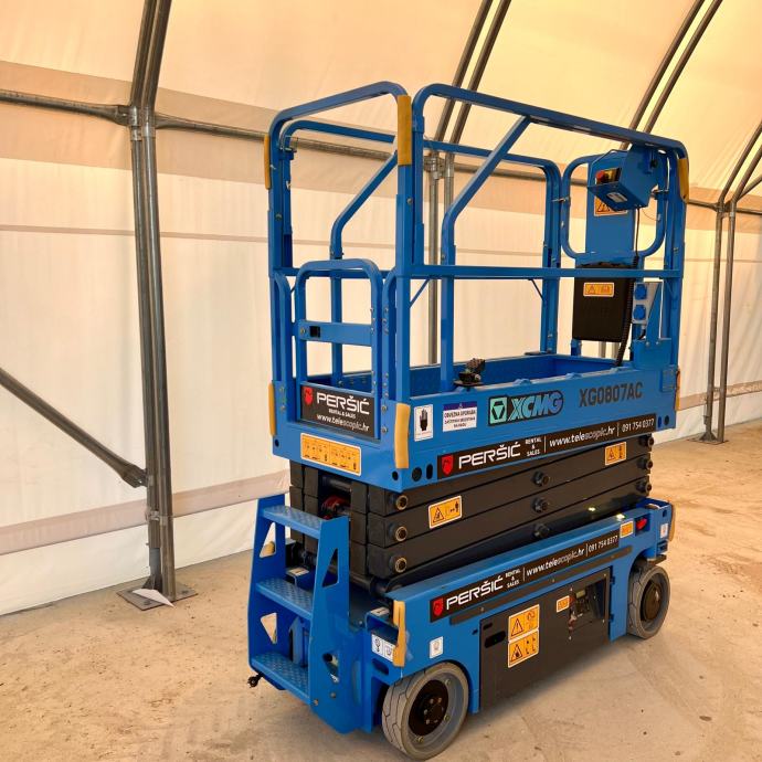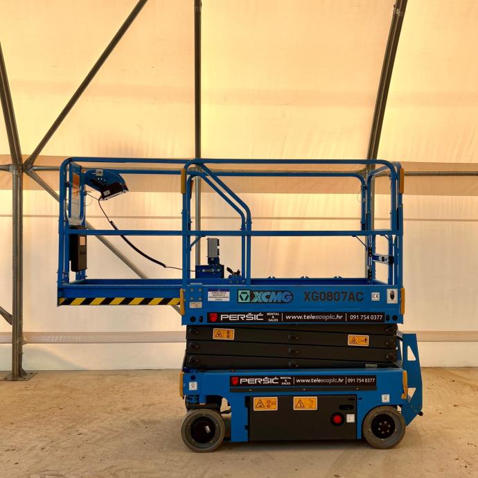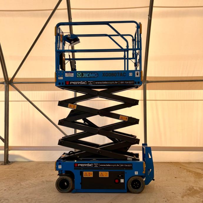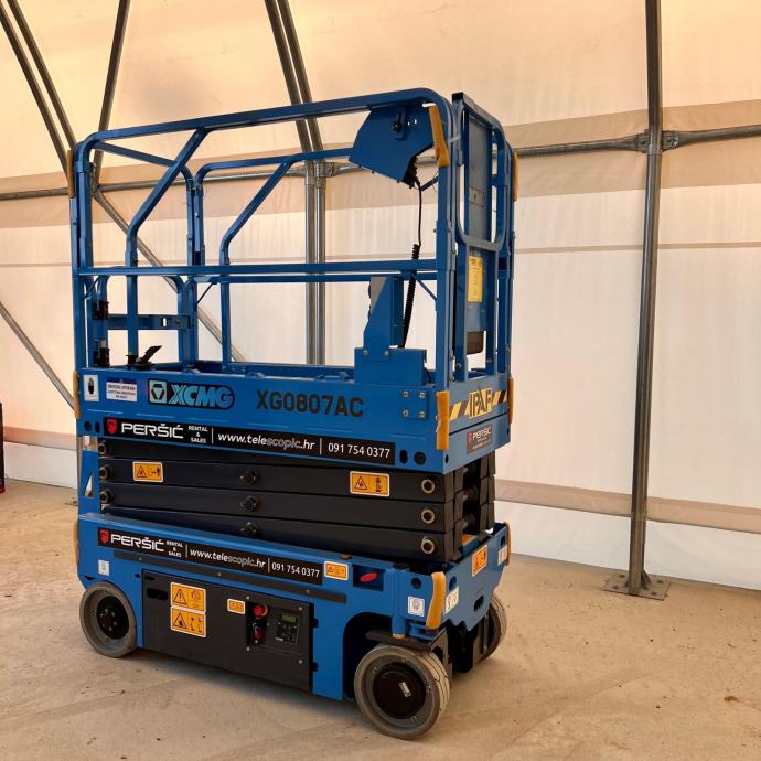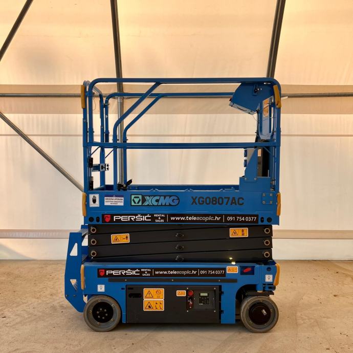 Električna Škarasta Platforma XCMG XG0807AC je platforma s radnom visinom do 7,80 metara dostupna za najam. Svojim je radijusom okretanja i lakoćom upravljanja savršena sve vrste prostora. Potpuno je električna, što ju čini vrlo tihom te ekološki prihvatljivom.