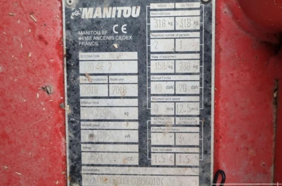 Podizna platforma Manitou 120 SE 2, godina proizvodnje 2018., 90 radnih sati, 2700 kg, 12 metara radna visina potpuno ispravna. Tel 0913003333