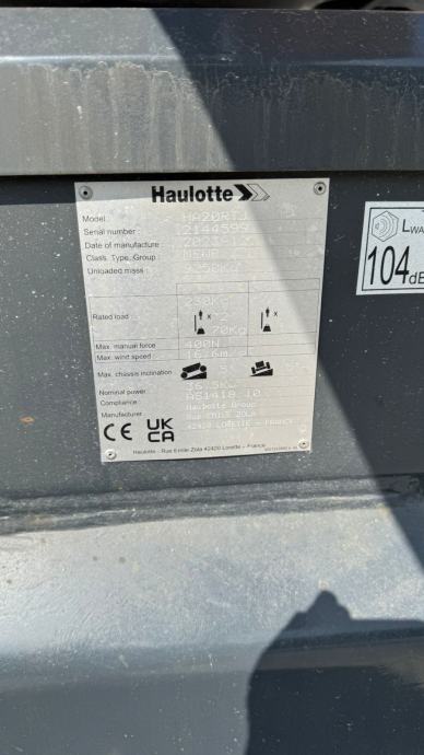 Platforma u odličnom stanju. Visina dizanja 20 metara. 2023.g., snaga motora 36,5 kw, 336 radnih sati, težina stroja 9250 kg.