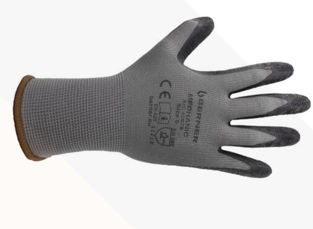 EN 420, EN 388, siva fino pletena tkanina s posebnim premazom od naboranog lateksa.
