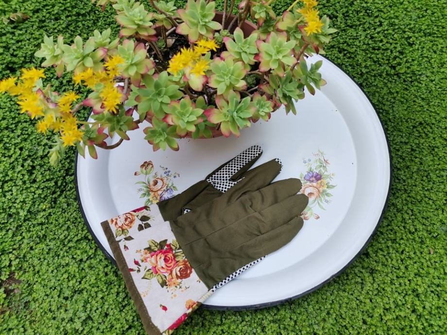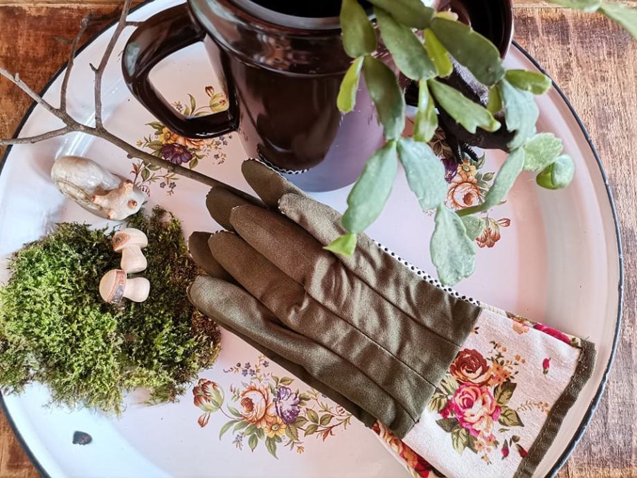 Nekorištene maslinasto zelene rukavice s uzorkom ruža na gornjem dijelu. Materijal izrade: pamuk.