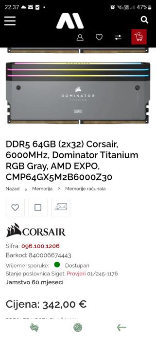 Prodajem navedeni kit, memorija je kupljena prije 2 mj. U adm-u, sve je ispravno i moguca je proba.