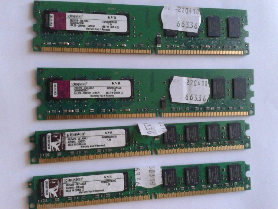 Prodajem 4 modula(keksa) po 2GB Kingston memorije, sva 4 iz iste serije(KVR800D2N6/2G), iste latencije istih chipova(Kingston) i iz istog računala.