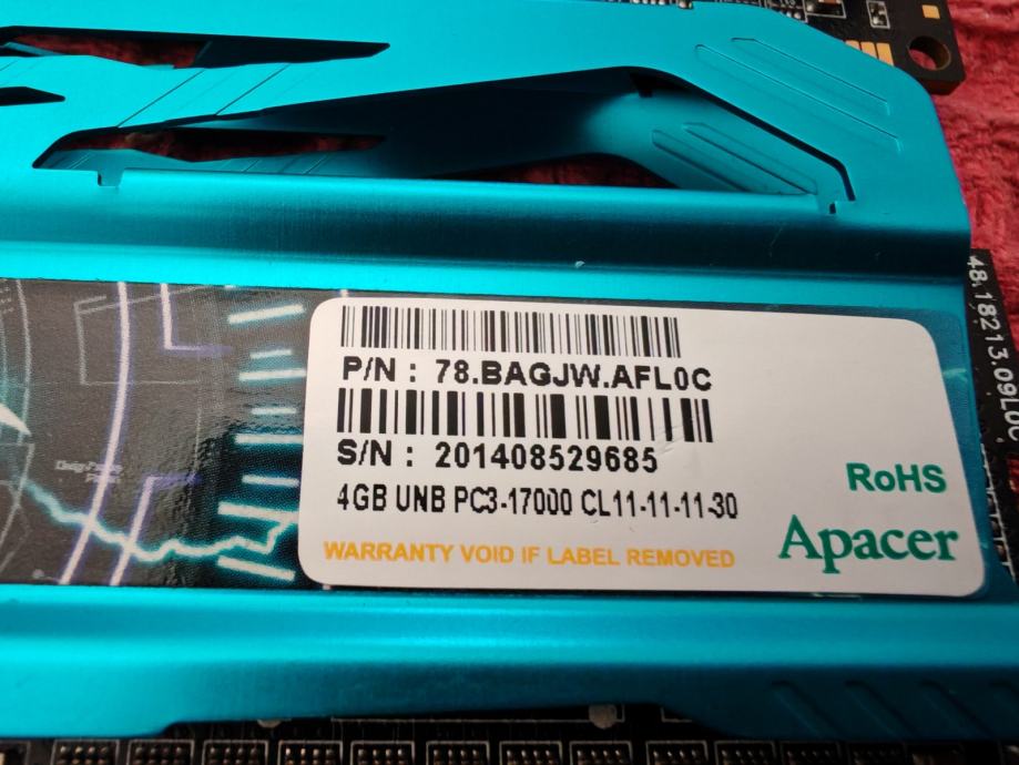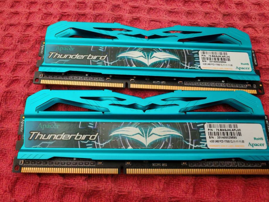 Prodajem komplet RAM memorije Apacer Thunderbird u konfiguraciji 2x4GB, ukupno 8GB. Radi se o DDR3 DIMM modulima s prepoznatljivim tirkiznim hladnjacima karakterističnog dizajna.