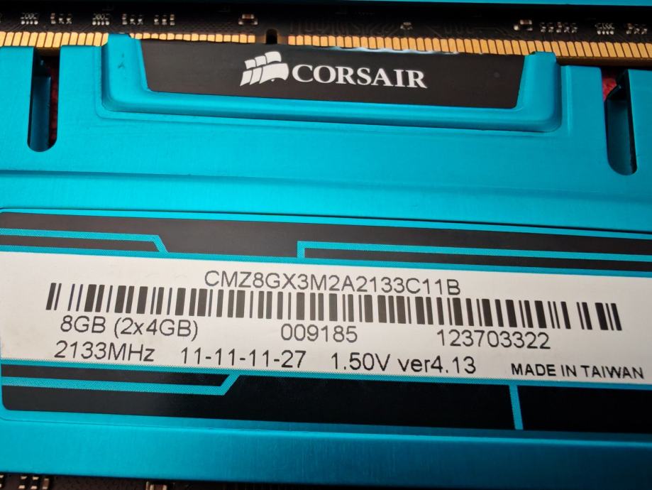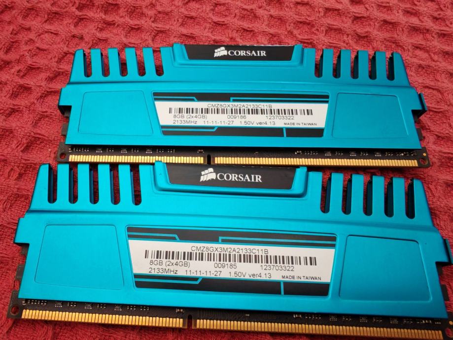 Prodajem Corsair Vengeance DDR3 memoriju, kit od 2x4GB (ukupno 8GB), u dual channel konfiguraciji. Radi se o DIMM modulima s brzinom od 2133MHz i timingom 11-11-11-27 pri naponu od 1.50V. Memorija dolazi u prepoznatljivom plavom hladnjaku serije Vengeance.