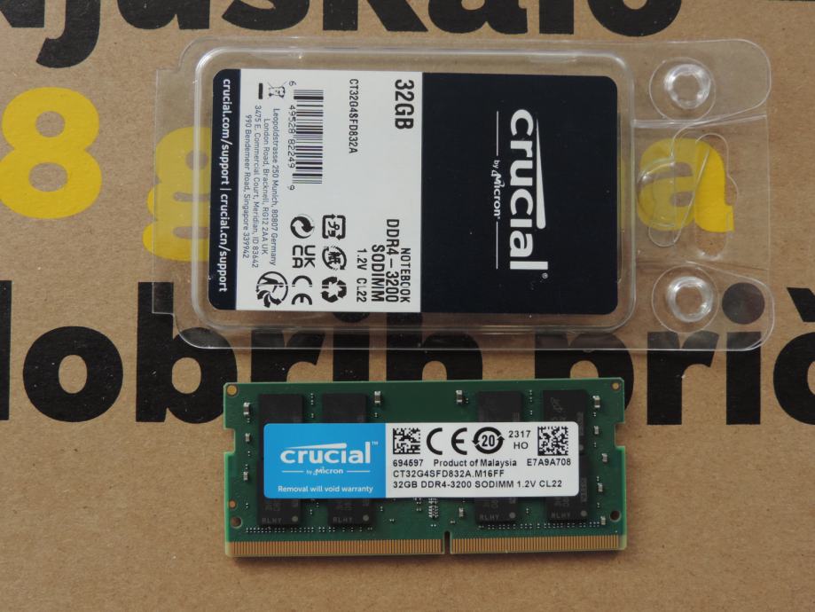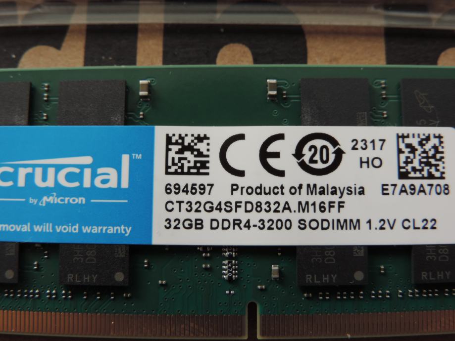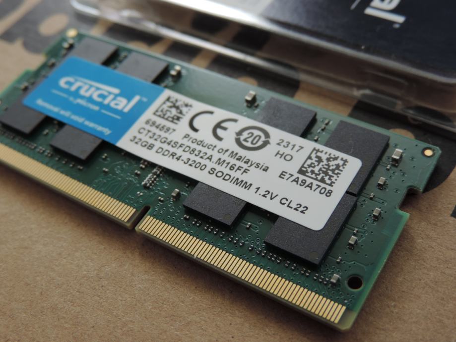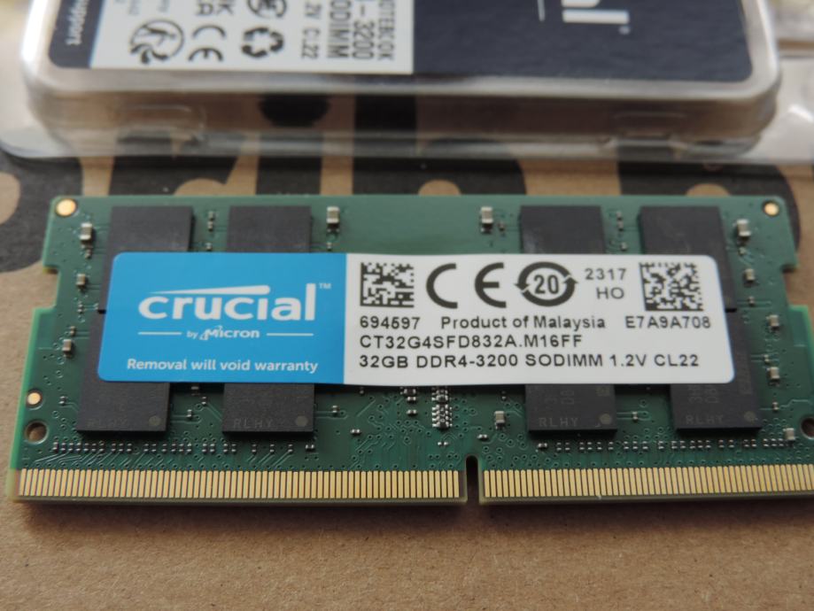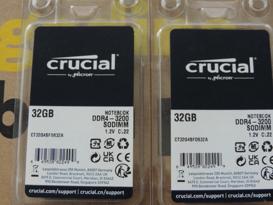 Na prodaju PAR MEMORIJA SODIMM od 32GB (UKUPNO 64GB) DDR4-3200 za prijenosna računala (laptop, notebook, mikro PC) PC4-25600 od proizvođača MICRON, MARKA CRUCIAL, model CT32G4SFD832A.M16FF u konfiguraciji 2Rx8 (Dual Rank). Memorije su uparene, ista serija, isti čipovi, isti lot, največa kompatibilnost i brzina.