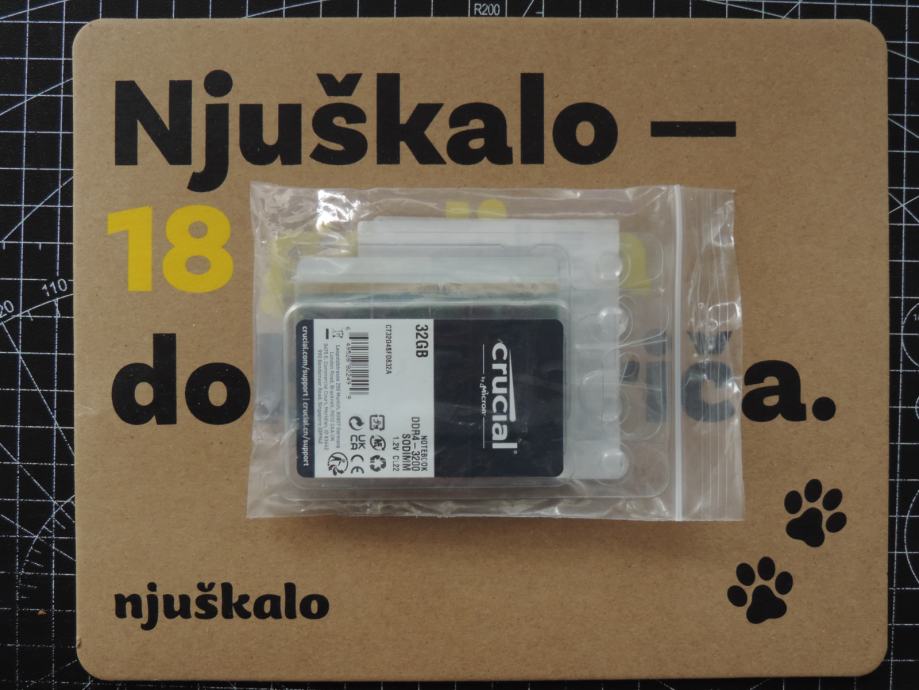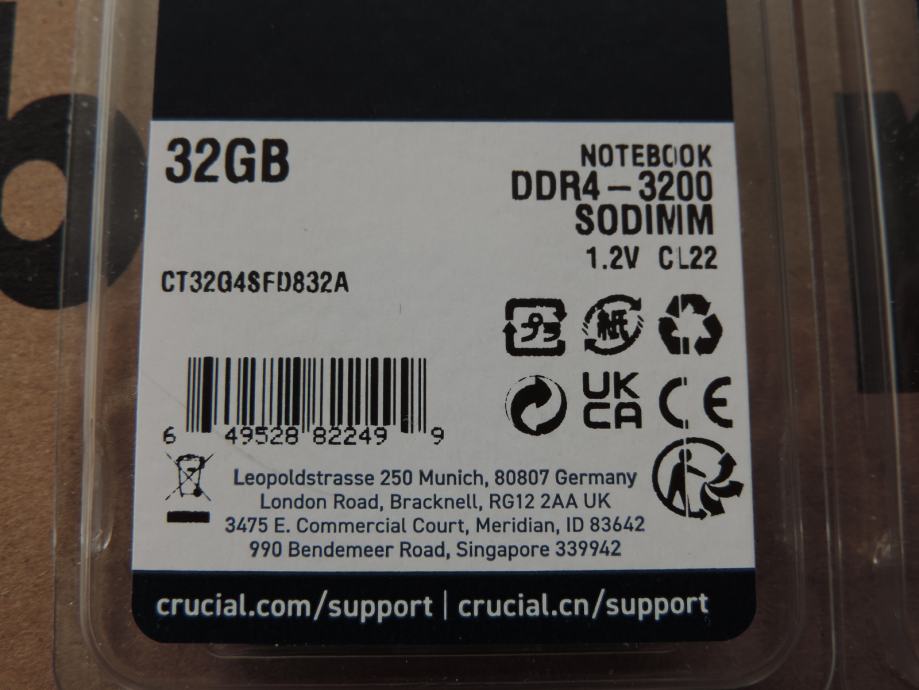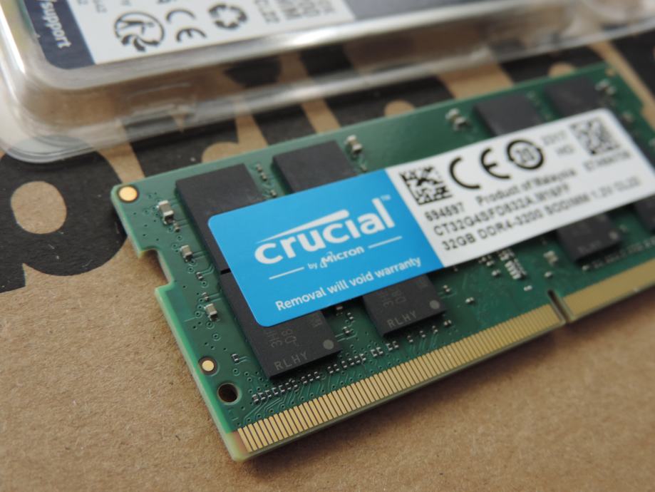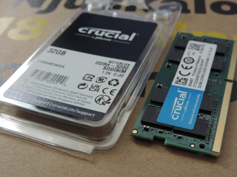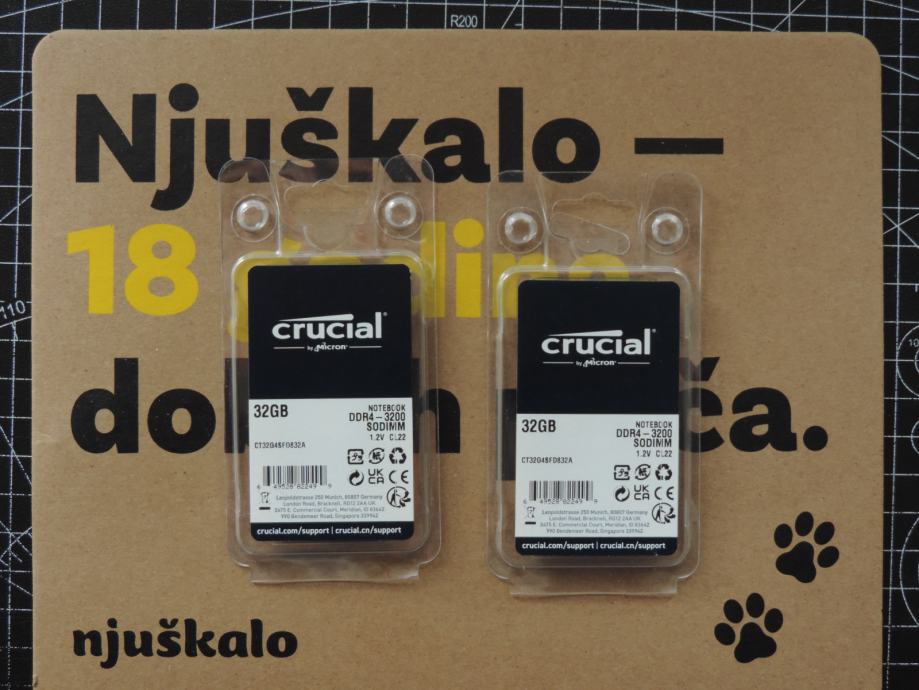 Na prodaju PAR MEMORIJA SODIMM od 32GB (UKUPNO 64GB) DDR4-3200 za prijenosna računala (laptop, notebook, mikro PC) PC4-25600 od proizvođača MICRON, MARKA CRUCIAL, model CT32G4SFD832A.M16FF u konfiguraciji 2Rx8 (Dual Rank). Memorije su uparene, ista serija, isti čipovi, isti lot, največa kompatibilnost i brzina.