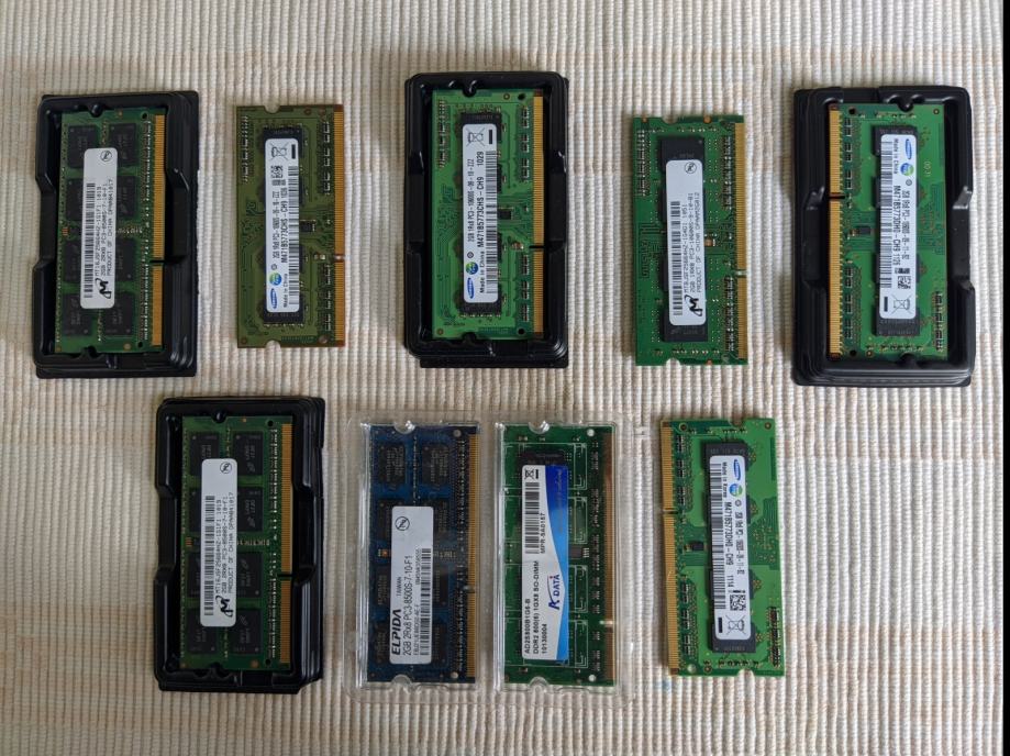 18 Gb RAM-a. 9 modula po 2 Gb, uglavnom PC3. Pločice bi trebale biti ispravne, ali ne mogu baš garantirati. Zato su povoljne. Sve za 10€.