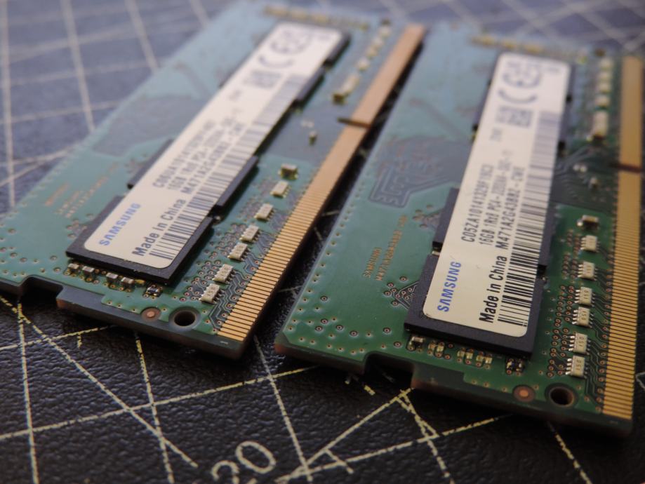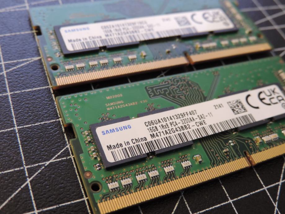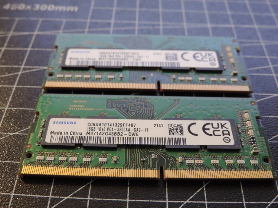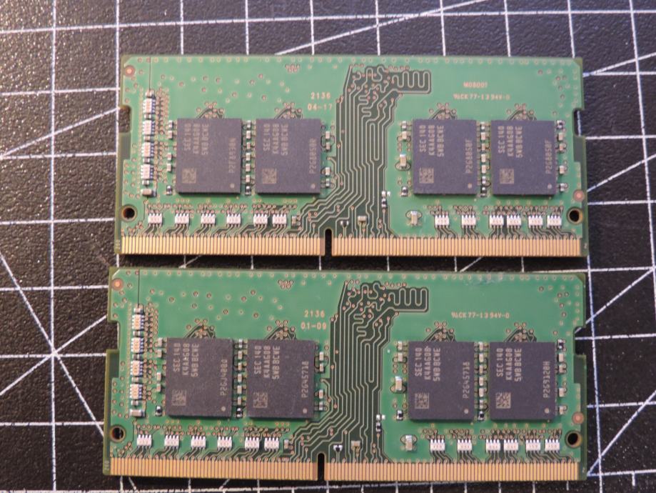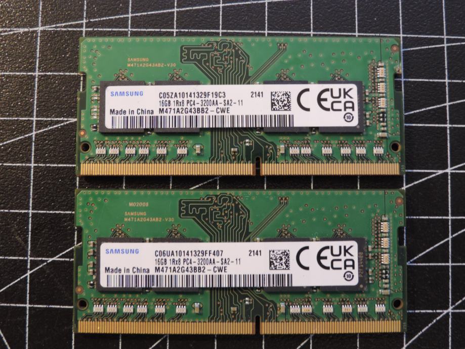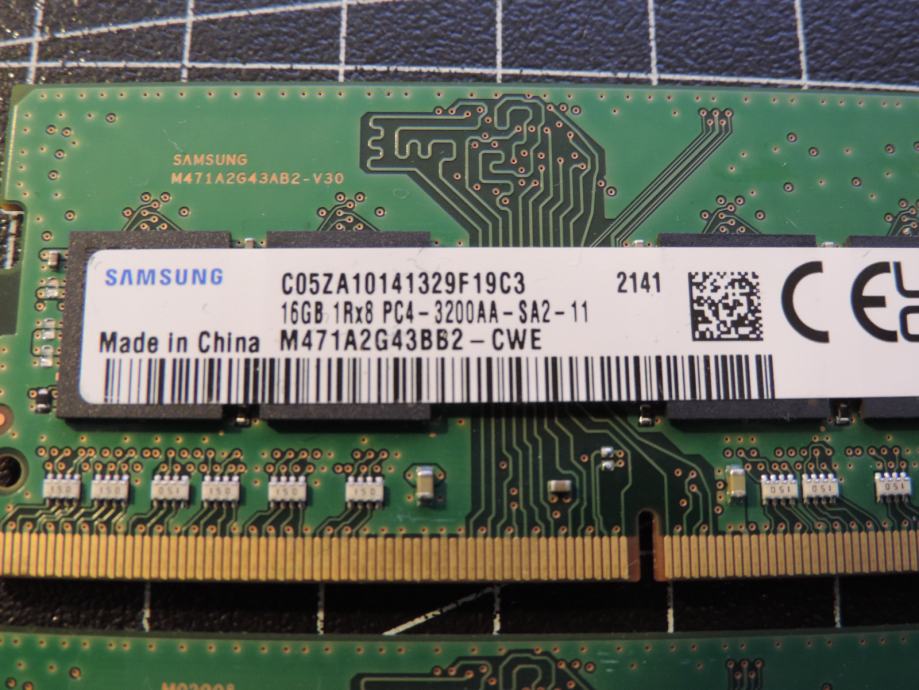Na prodaju DVIJE UPARENE (ISTI LOT, UPARENI ČIPOVI) MEMORIJE SODIMM od 16GB (UKUPNO 32GB) DDR4-3200AA-SA2-11 za prijenosna računala (laptop, notebook, mikro PC) PC4-25600 od proizvođača SAMSUNG model M471A2G43BB2-CWE u konfiguraciji 1Rx8 (1 x 64 bitni red sa 16bits "širokim" čipovima - 8 čipova na pločici).