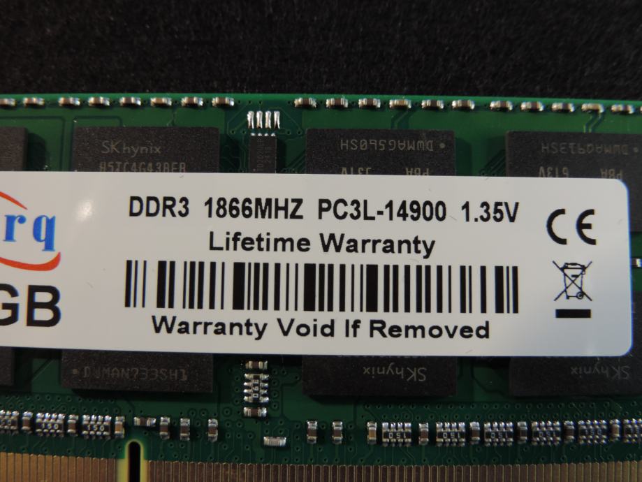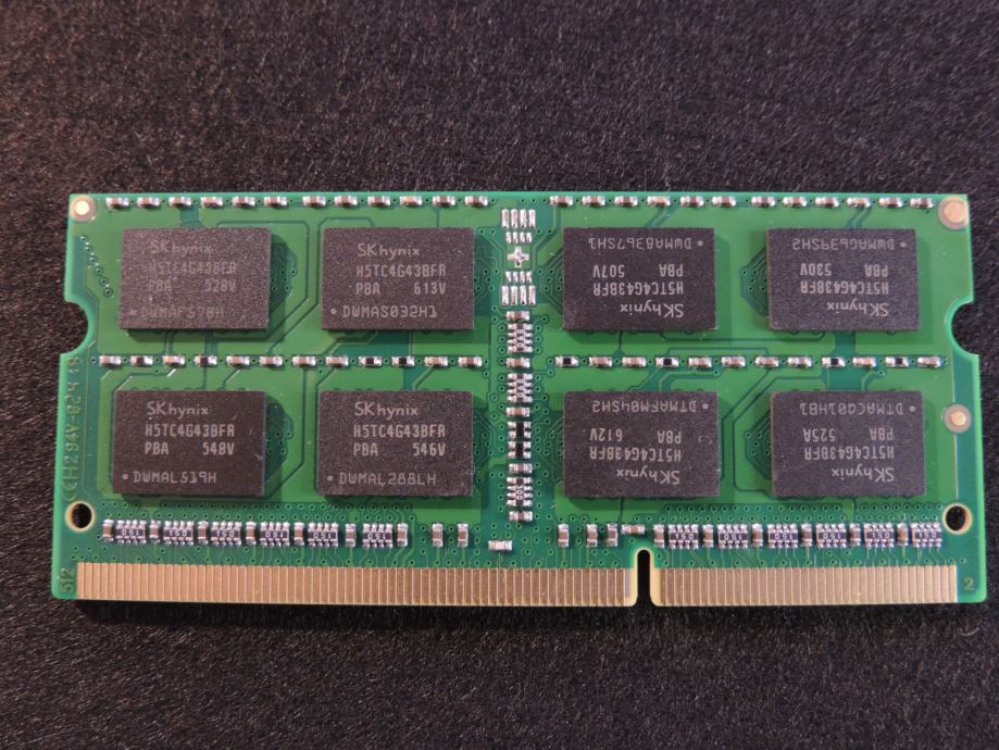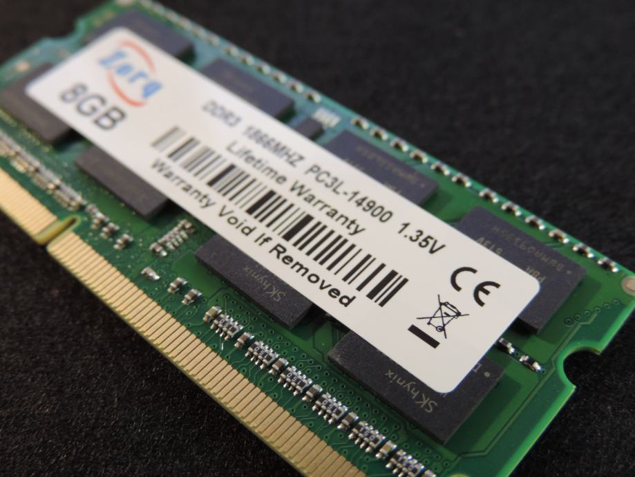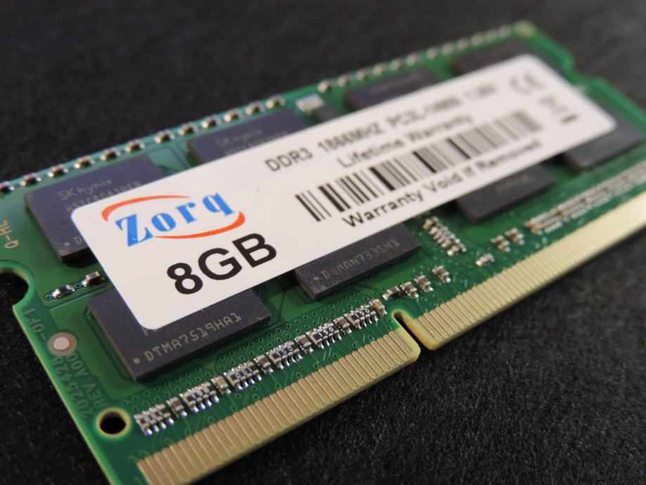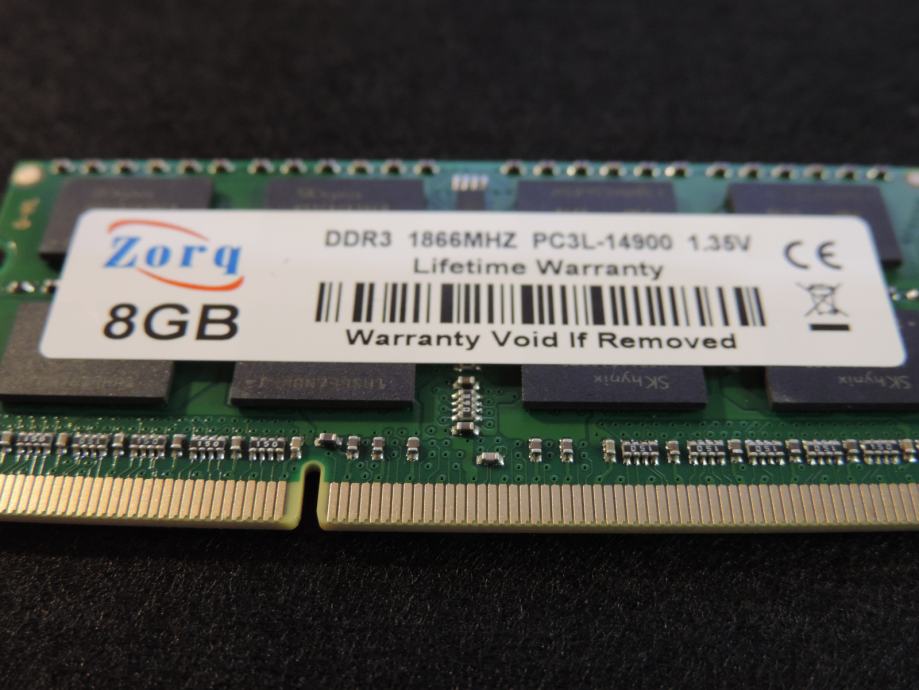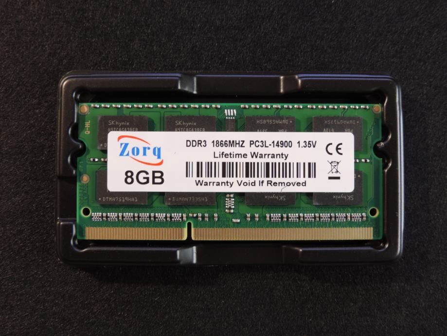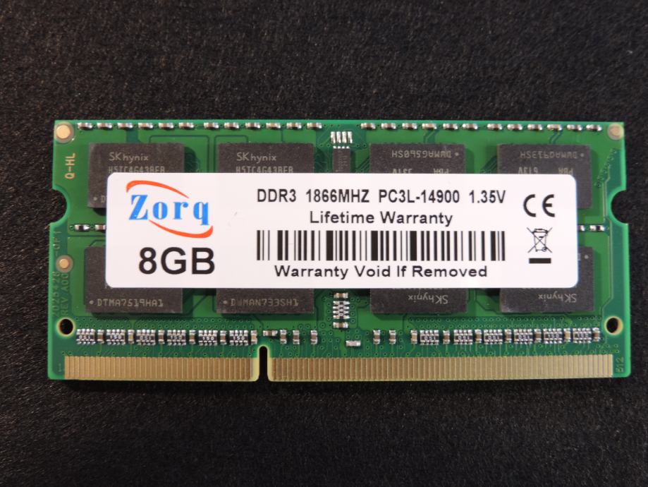 Na prodaju JEDNA MEMORIJA od 8GB PC3L-14900S-13-13, 1.35V (Low Voltage DDR3L) za prijenosna računala (laptop, notebook, mikro PC) DDR3 (DDR3L) od proizvođača ZORQ (čipovi SK HYNIX) model H5TC4G43BFR-PBA u konfiguraciji 2Rx8 (2 reda od 8 čipova na pločici). Memorija je kompatibilna sa svim prijenosnicima kojima trebaju DDR3 memorije od 1.35V i maksimalna brzina do 1866MT/s, garantirano ili vraćam novac nakon povrata memorije. SK HYNIX jedan od najvećih i najboljih proizvođača memorijskih čipova zajedno sa Samsung-om i Micron-om.