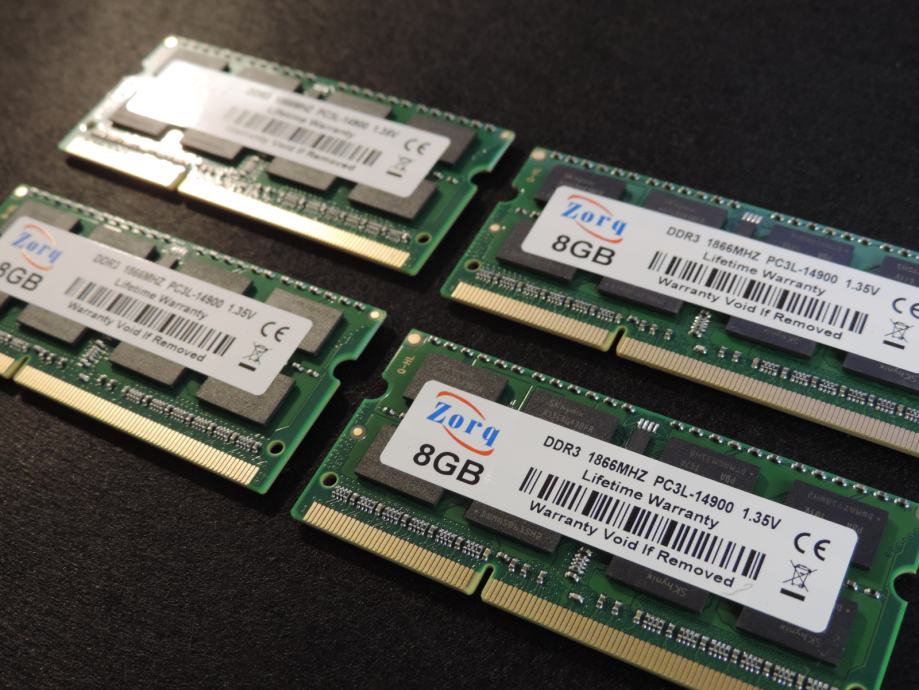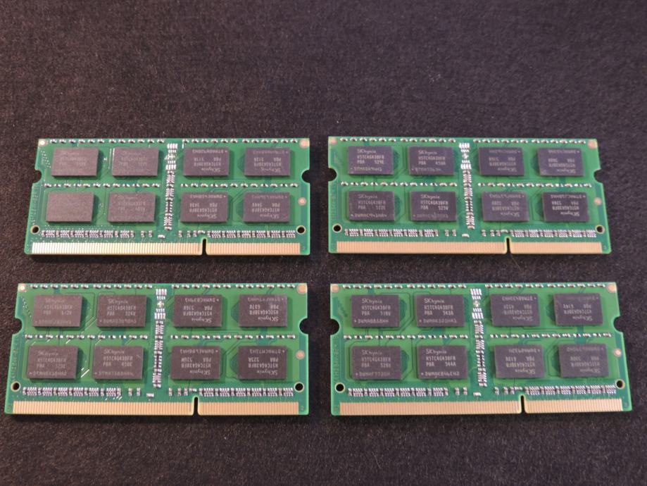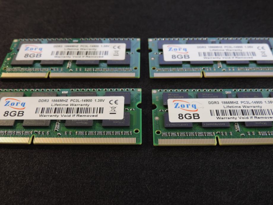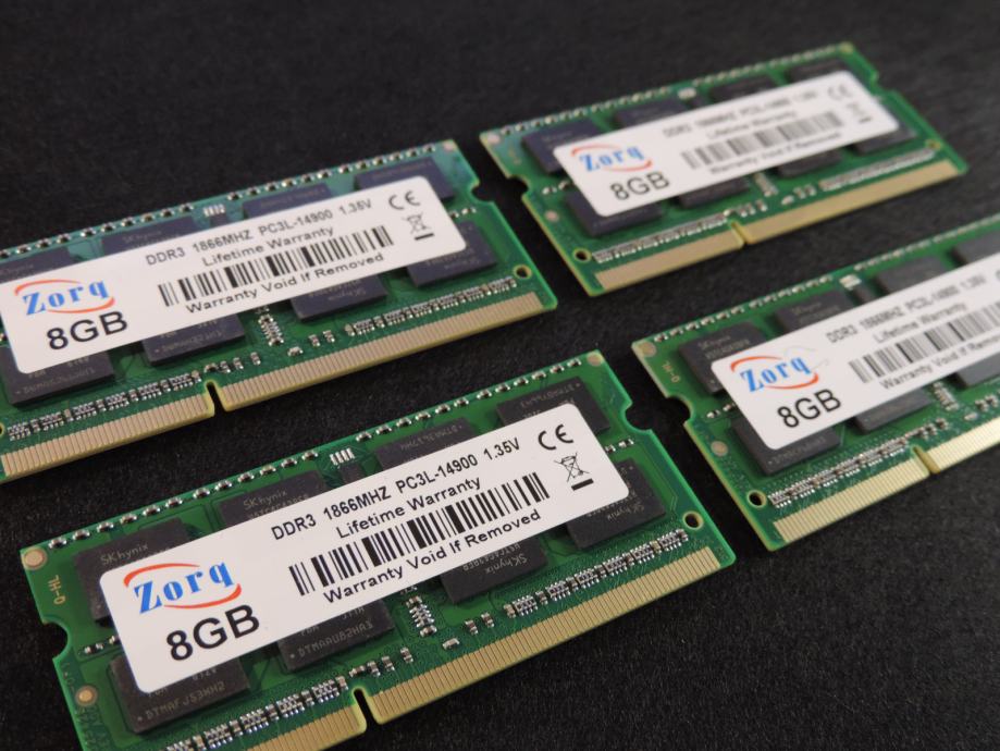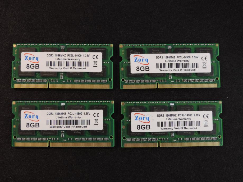Na prodaju ČETIRI MEMORIJE (ČETIRI PLOČICE) od 8GB (UKUPNO 32GB) za prijenosna računala (laptop, notebook, mikro PC) DDR3 (DDR3L) od proizvođača ZORQ (čipovi SK HYNIX) model H5TC4G43BFR-PBA u konfiguraciji 2Rx8 (2 reda od 8 čipova na pločici) PC3L-14900S-13-13, 1.35V (Low Voltage DDR3L). Memorija je kompatibilna sa svim prijenosnicima kojima trebaju DDR3 memorije od 1.35V i maksimalna brzina do 1866MT/s, garantirano ili vraćam novac nakon povrata memorije. SK HYNIX jedan od najvećih i najboljih proizvođača memorijskih čipova zajedno sa Samsungom i Micronom.