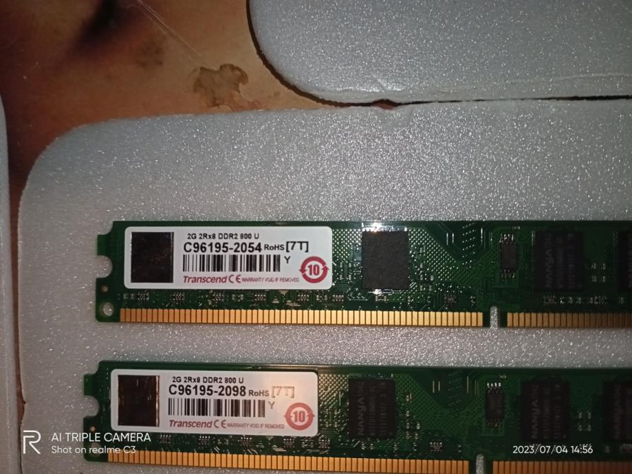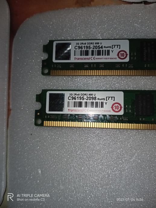 Prodajem 2 modula Trascend memorije po 2 GB 800 Mghz.(Pogledaj fotografije).Ispravne su i u odličnom stanju.Mogu poslati i poštom,kupac plaća troškove poštarine.Cijena je fiksna.(kupujete na vlastiti rizik)